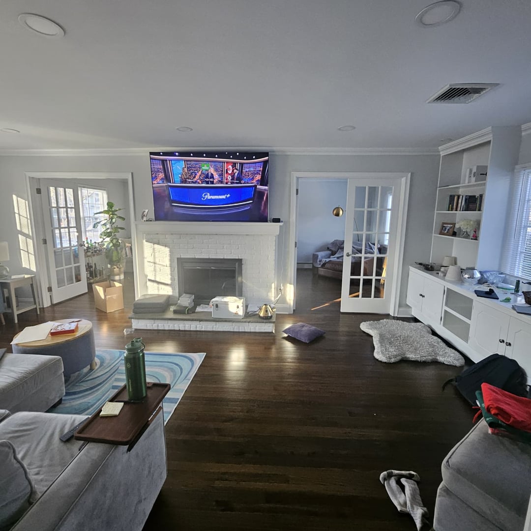 My fireplace protrudes pretty far into the center of the floor, creating a weird "notch" in the layout. Because of this, a standard rectangular rug either hits the hearth or isn't large enough for all of my furniture pieces to fit on. If I get one long area rug, the spaces near the french doors on either side of the fireplace will be cut off and one of my side tables would potentially be off the rug completely. I looked into custom-cut rugs to fit around the fireplace, but I am not sure if I want to make that financial investment right now.