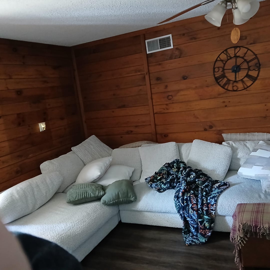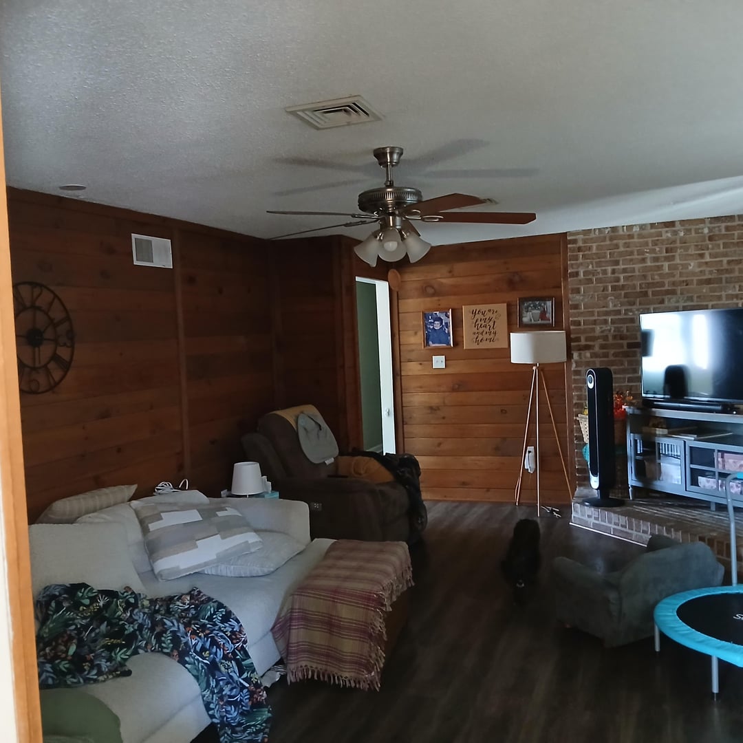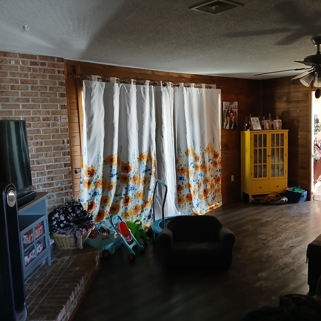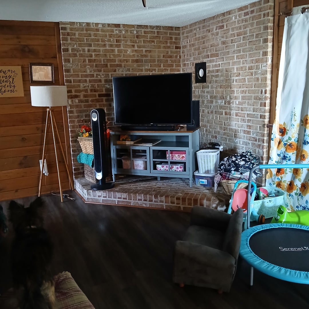 I’m gonna try to be as nice as a can. Nothing you own seems to be something you take pride in. You posted a very messy house on the internet for everyone to see. The brick area as a TV area is fine but you need to find some photos online of rooms with brick and wood paneling and see if you can muster some inspiration. Right now I don’t even know where to start because nothing really goes with anything else, it’s dark with the shades drawn, and you have no real indication of what you like or dislike in your own home.
