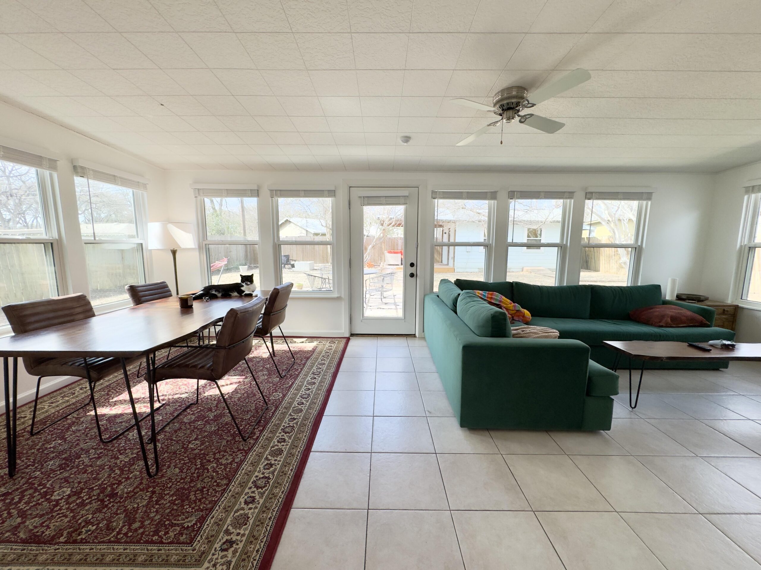 I’d do a natural jute rug. It’s perfect for sunrooms, brings organic texture and is netural enough to not fight with the red dining rug.