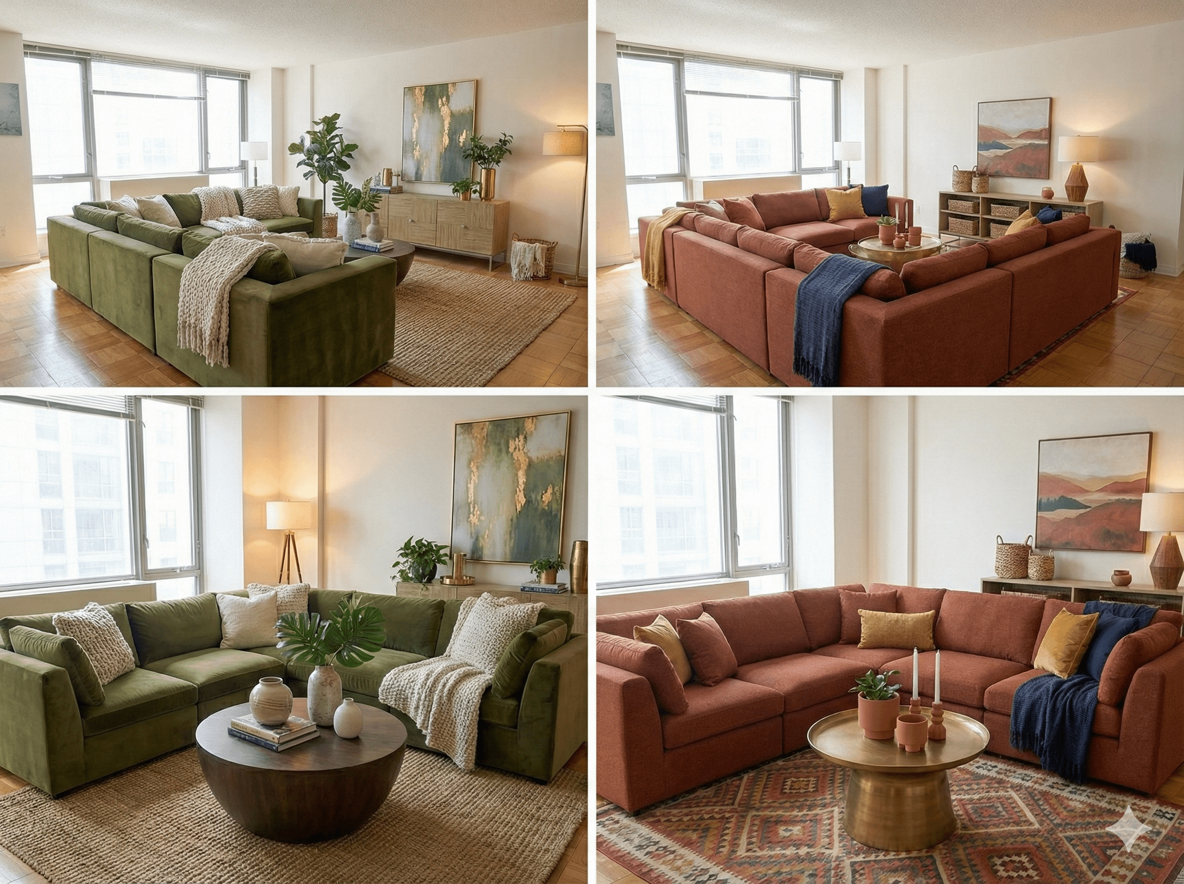 I'm trying to grab a couch for my new apartment and everyone is recommending green. I'm not the best at decorating, but the "vibe" I want is cozy, masculine, bright and not too dark. Here's a generated image showing the couch. Am I missing something here with the green? The red/orange seems to be more what comes to mind to me but is not getting any love from my friends haha. I don't want the space to feel dull and washed out