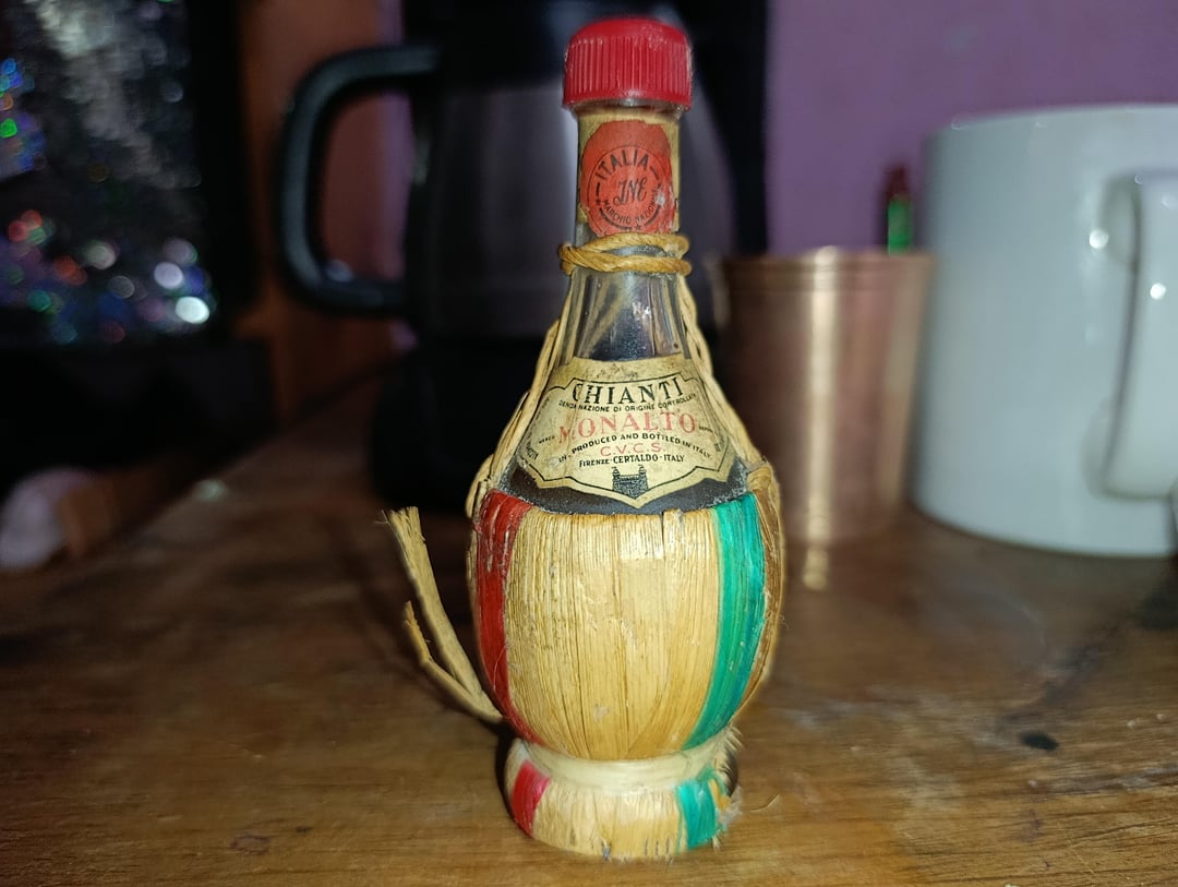 IndependentBoof 2 hours ago Chianti in a fiasco (bottle with straw covering).The top looks to be a screw-top instead of a cork, which is a little unorthodox, but isn’t unheard of.