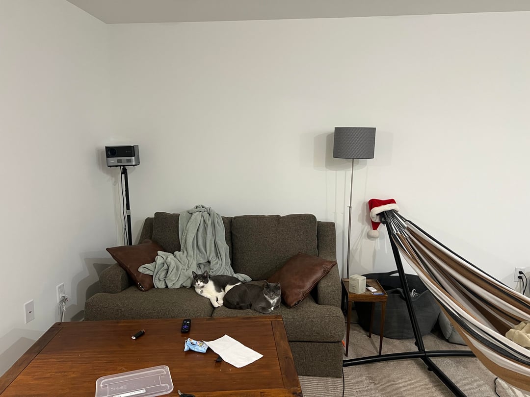 Hi, I just moved into my first place without any roommates! I’m trying to figure out how to decorate but I’m running into a problem. I have this space that’s perfect to project tv on, but I don’t know what furniture to put in/around it. If I do anything to high it will block the “screen” and I can’t think of anything that low to put. It feels odd to leave the space devoid of any personality (please ignore the things that are currently there I just moved in), but I also have no idea how to add personality to the opposite wall. I would really appreciate furniture ideas for the TV wall and maybe gallery ideas for the wall above the couch. Anything ideas would be helpful thank you!!