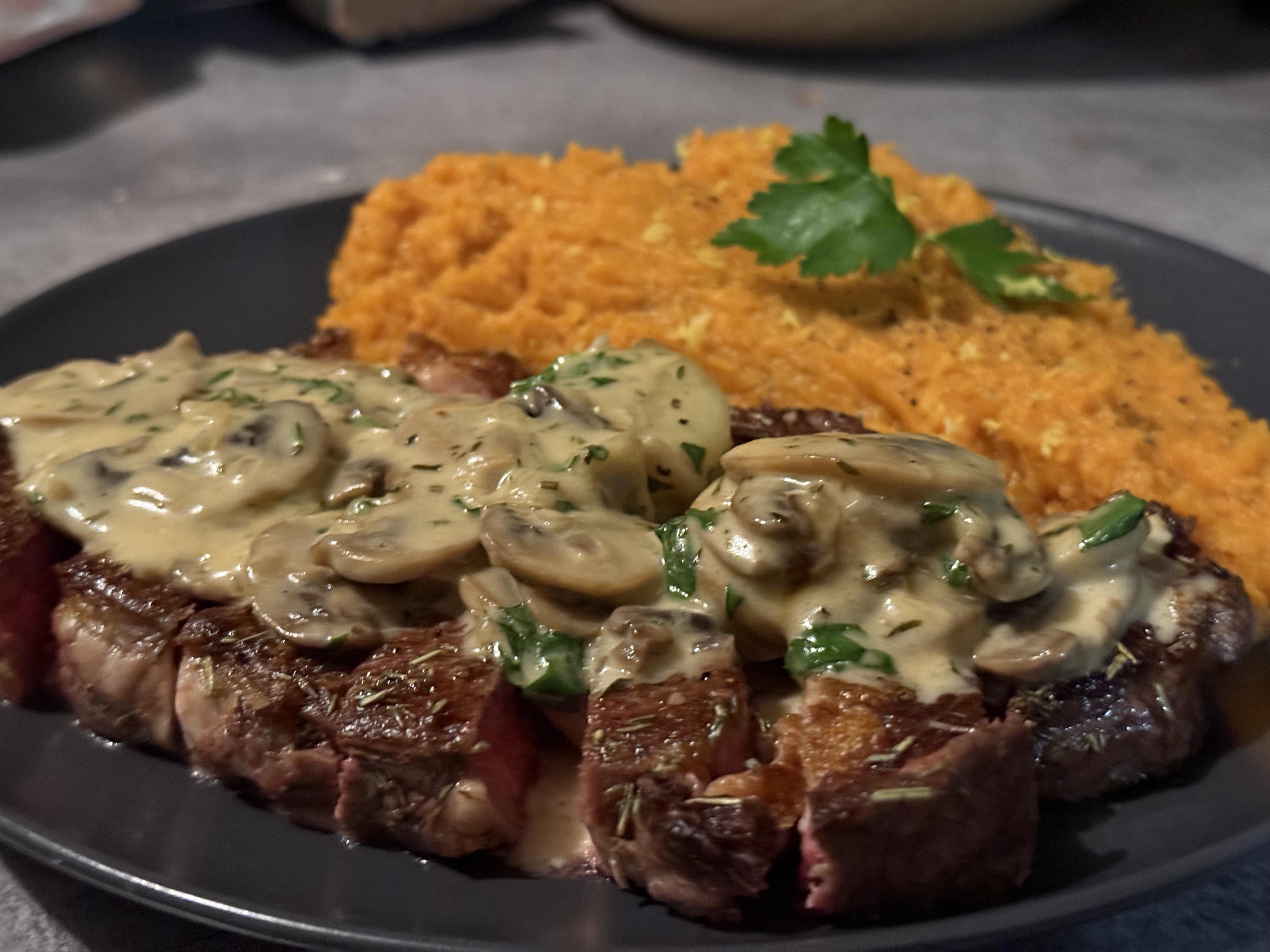 Bifteck aux champignons, purée de patate douce