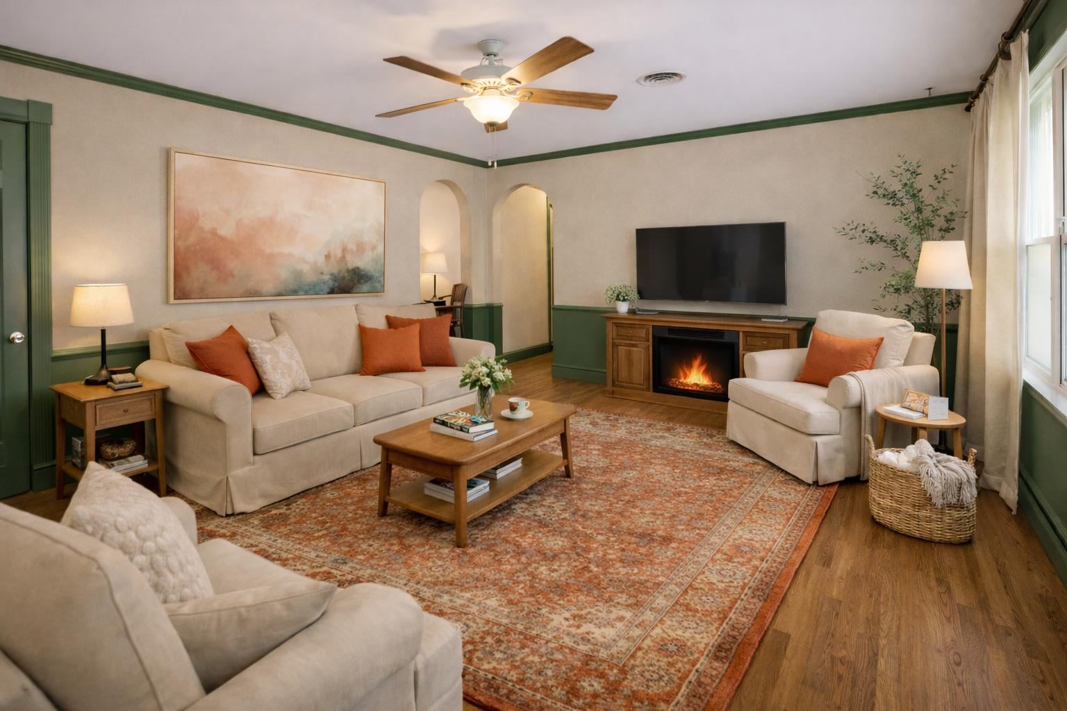 Things I don’t like: chair rail in living rooms, and the all the matching furniture. A neutral sofa is fine, but I would select 2 coordinating chairs instead. The ceiling fan looks like it was from the 90’s.