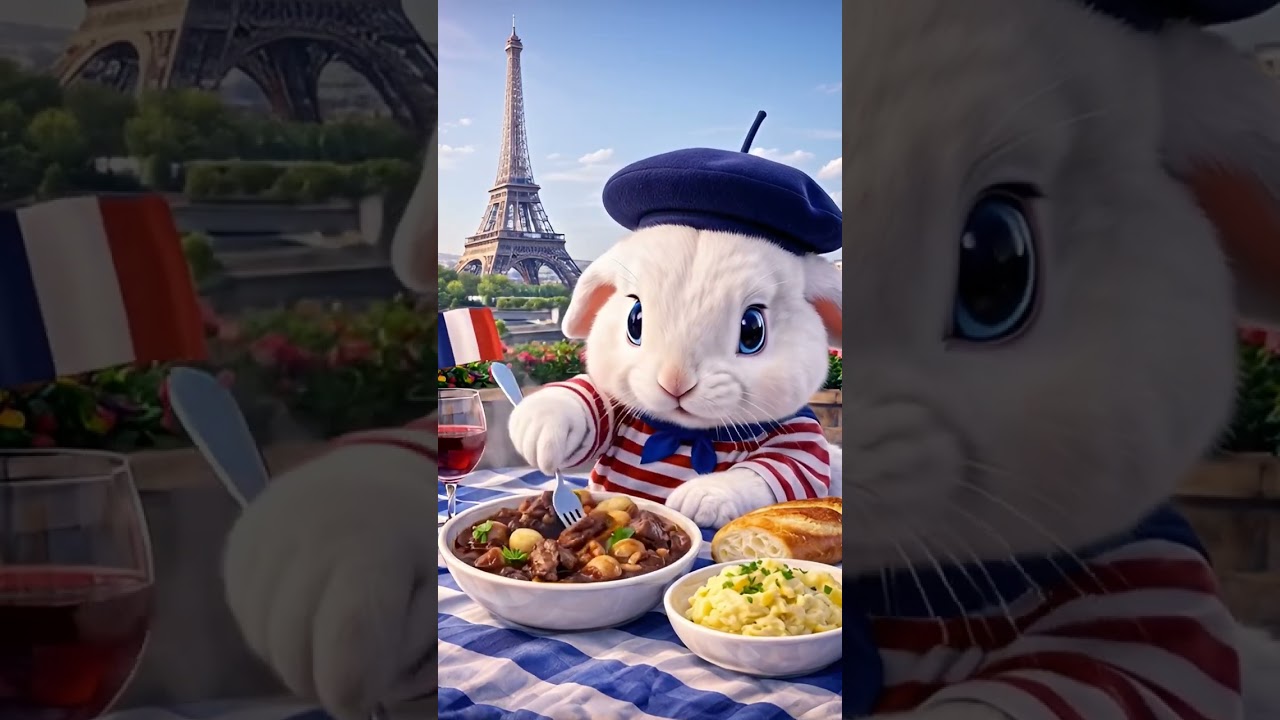 A cute bunny wearing French style outfit enjoying delicious traditional French food in front of the Eiffel Tower! 🗼🥩🥖🍷