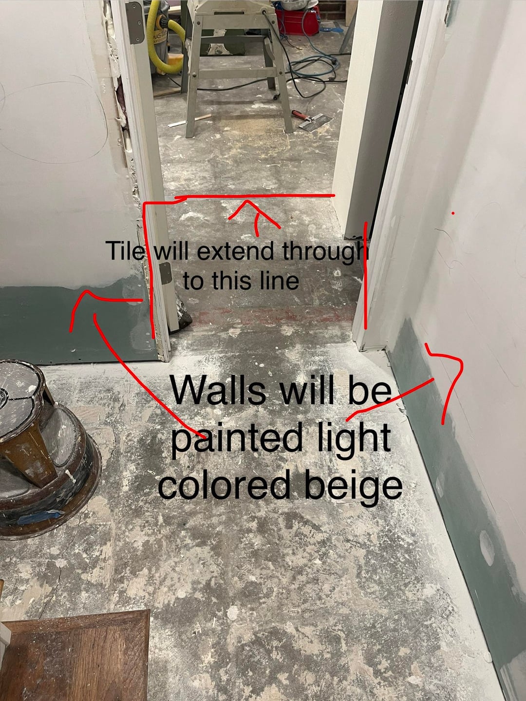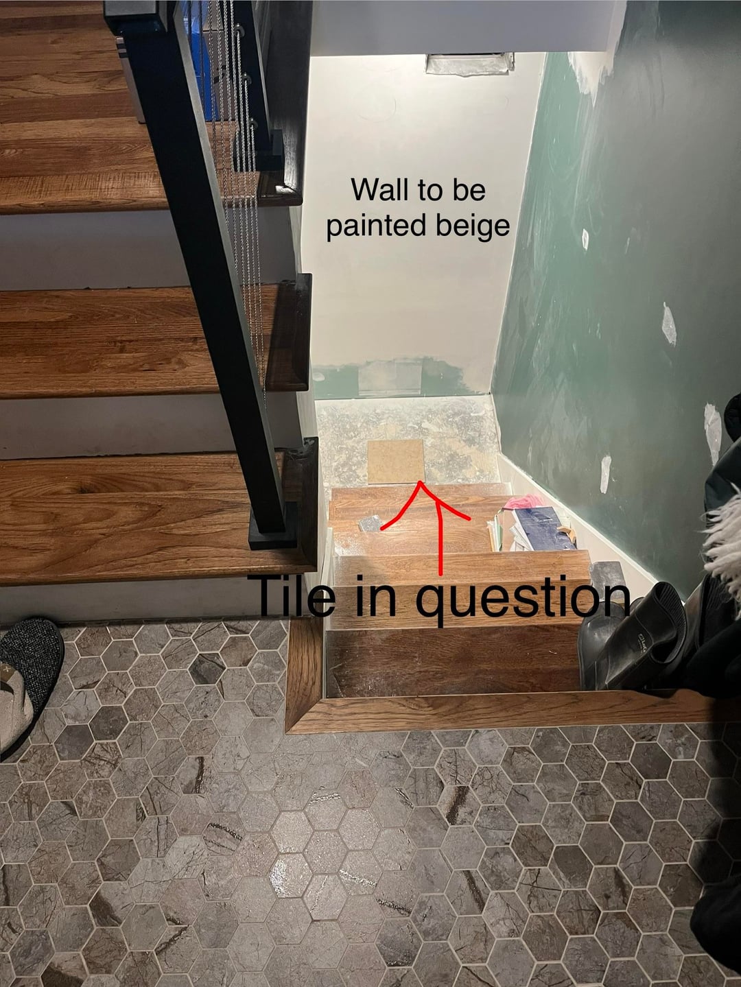 I think what’s throwing you off is the tile is the only “updated” element you’re seeing now. I would ‘mock up’ the area down there to be as close to the future IRL conditions as possible: paint that back wall beige (and what about the side wall??), change the lightbulb color if that’s something you plan to do, are the stair treads staying as is?, etc.