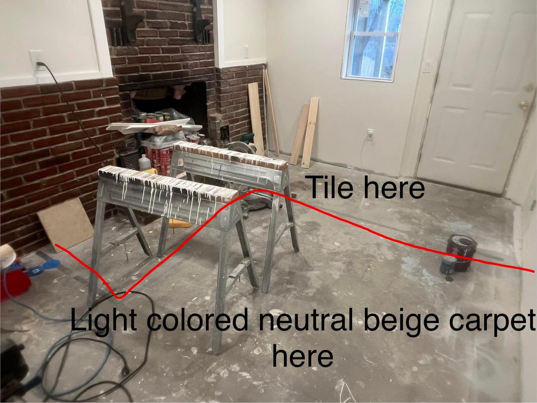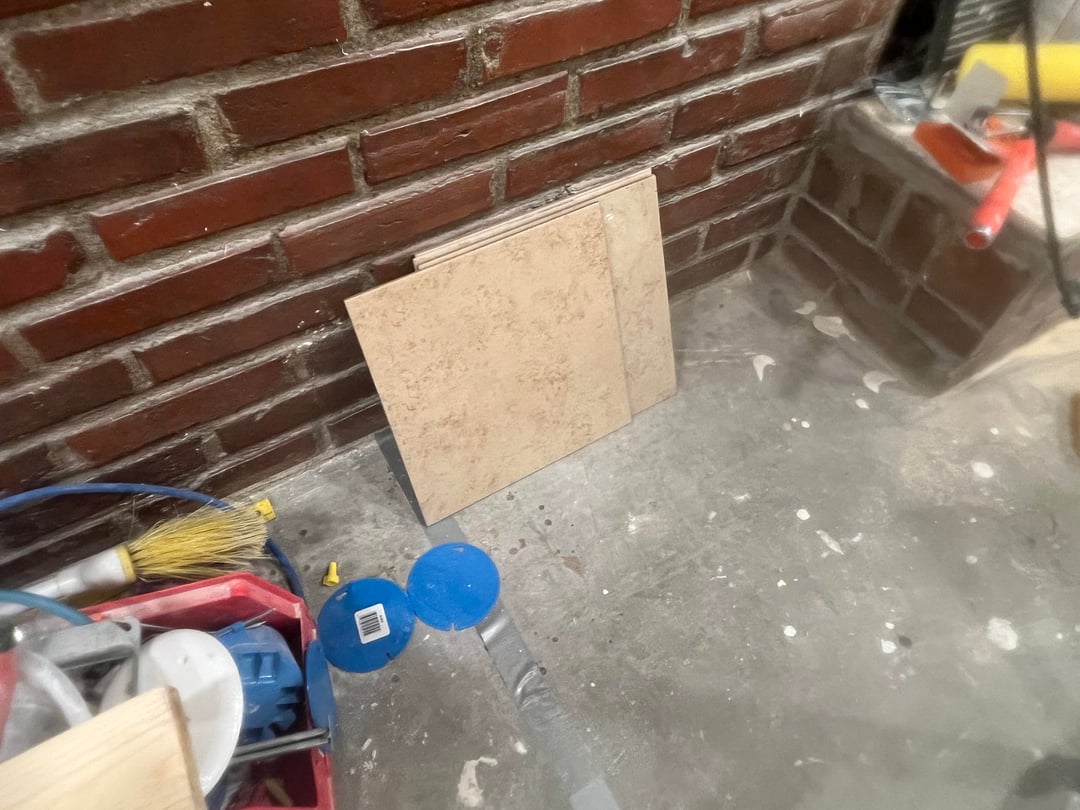 I’ve had an ongoing home renovation for about 4 years now. We are finally close to finishing our basement & are now choosing floor tile. The tile at the bottom of my stairs is what we used on the basement bathroom floor, but when I set the tile in this location to visualize it, I thought it looked a bit out of place when looking at it from my front entrance. Another thought is will this tile look good against the red brick wall in my basement family room (in another photo). The basement tile will lead into the basement family room where it will meet with a light colored neutral beige carpet, then tile will begin again near my fireplace & exterior door (see photos).