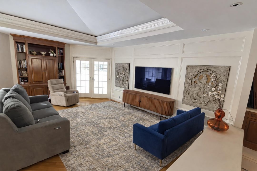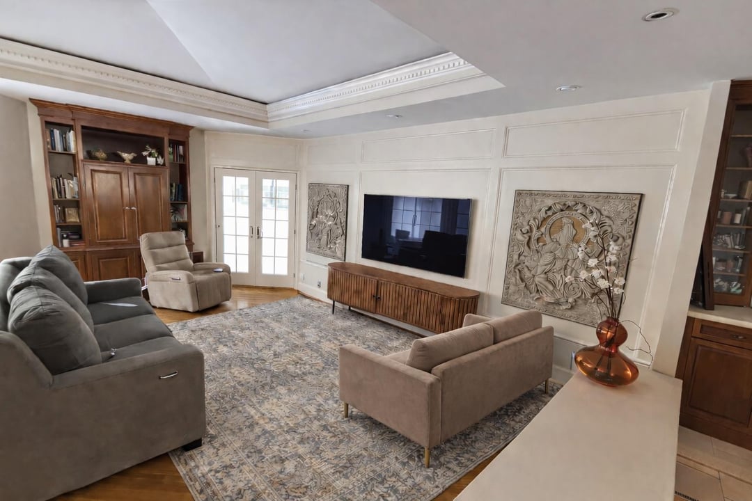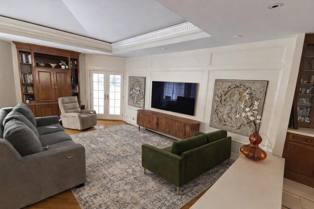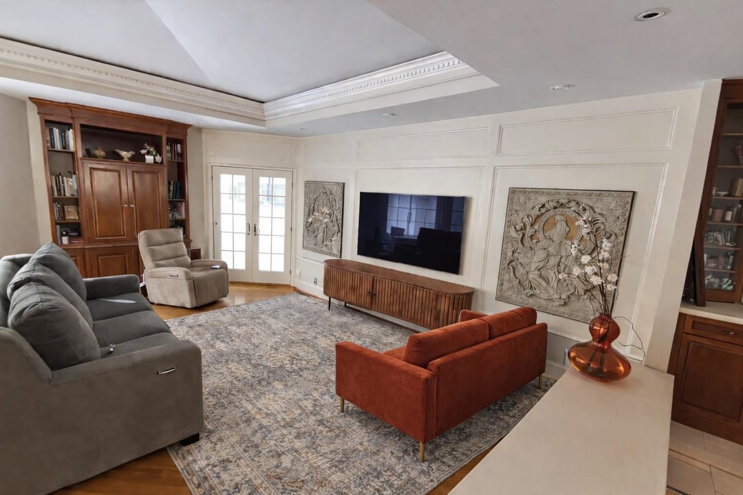 Which loveseat color option to pick? I want the room to be sophisticated yet welcoming. This is a family room: informal, lounging, close friends, TV watching. Ignore the furniture placement- the gray sofa and light camel recliner were just delivered. I know they need to be placed closer. This is the best I could do with AI.