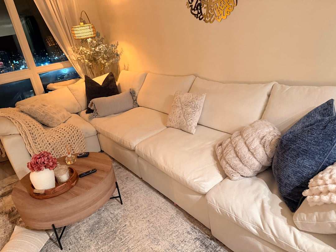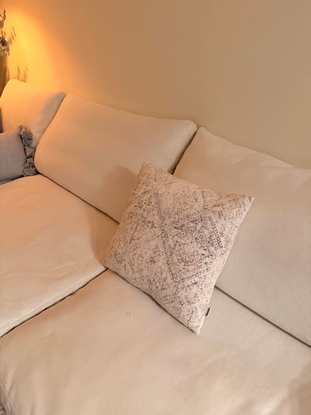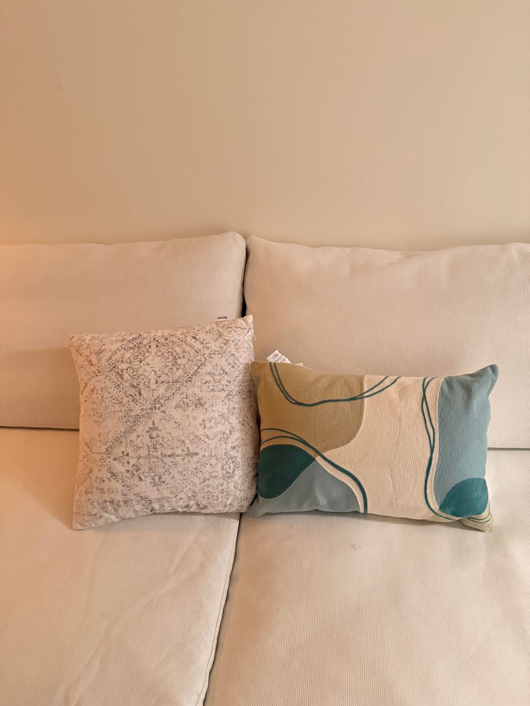 Can you tell me if the blue looks weird? I have mood lighting and love the warmth and cozy feeling but I don’t know if the blues are throwing it all off? I thought it would be nice to match the blue in the carpet but now I don’t know!! It was too hard to find brown but any other suggestions?? And pillow sizes/styles? Thank you!