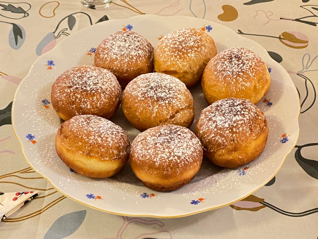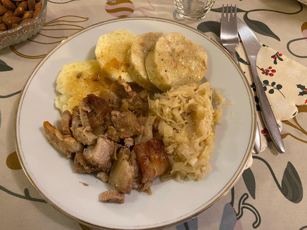 Pork neck and belly výpečky, Karlsbader and breadroll dumplings, sweet cabbage. Kobliha with apricot and strawberry jam filling. I used to be vegetarian for many years, but kept having dreams about výpečky during lockdowns. Now we’re here.