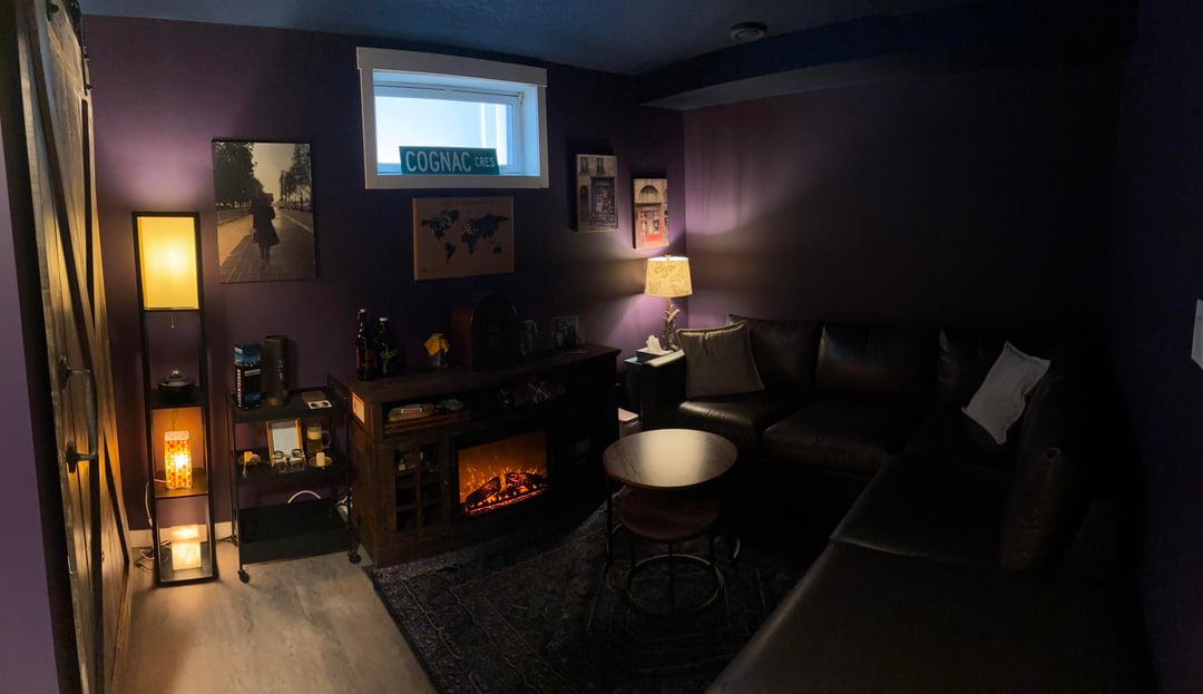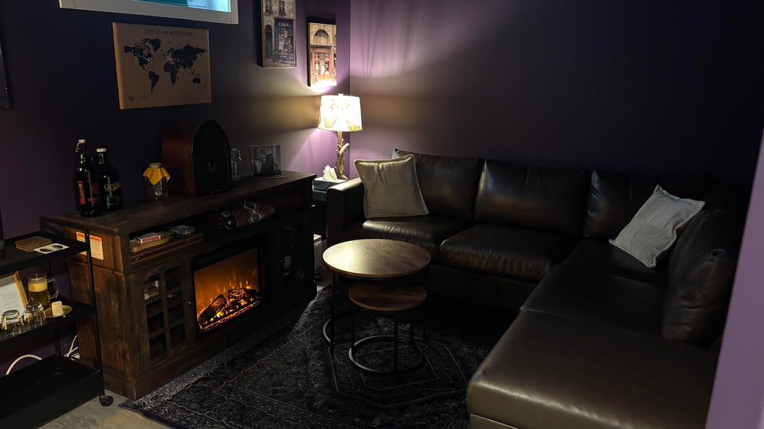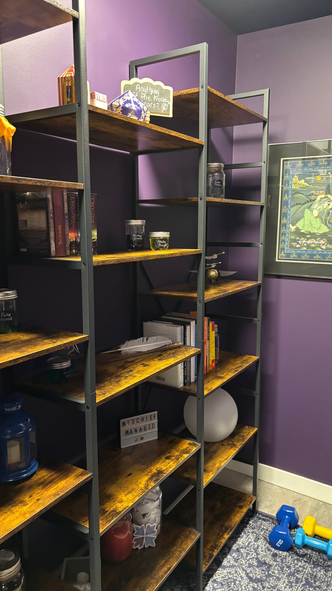 It’s an awkward space to photograph, but I’m really excited to share how my speakeasy is coming along! This is a dark room in the basement so we leaned into the vibes and painted it dark purple and dark blue. The big walk in closet is basically wall to wall bookshelves, and the main space will be a cozy place to hang out and listen to the radio or audiobooks, play crib, etc.