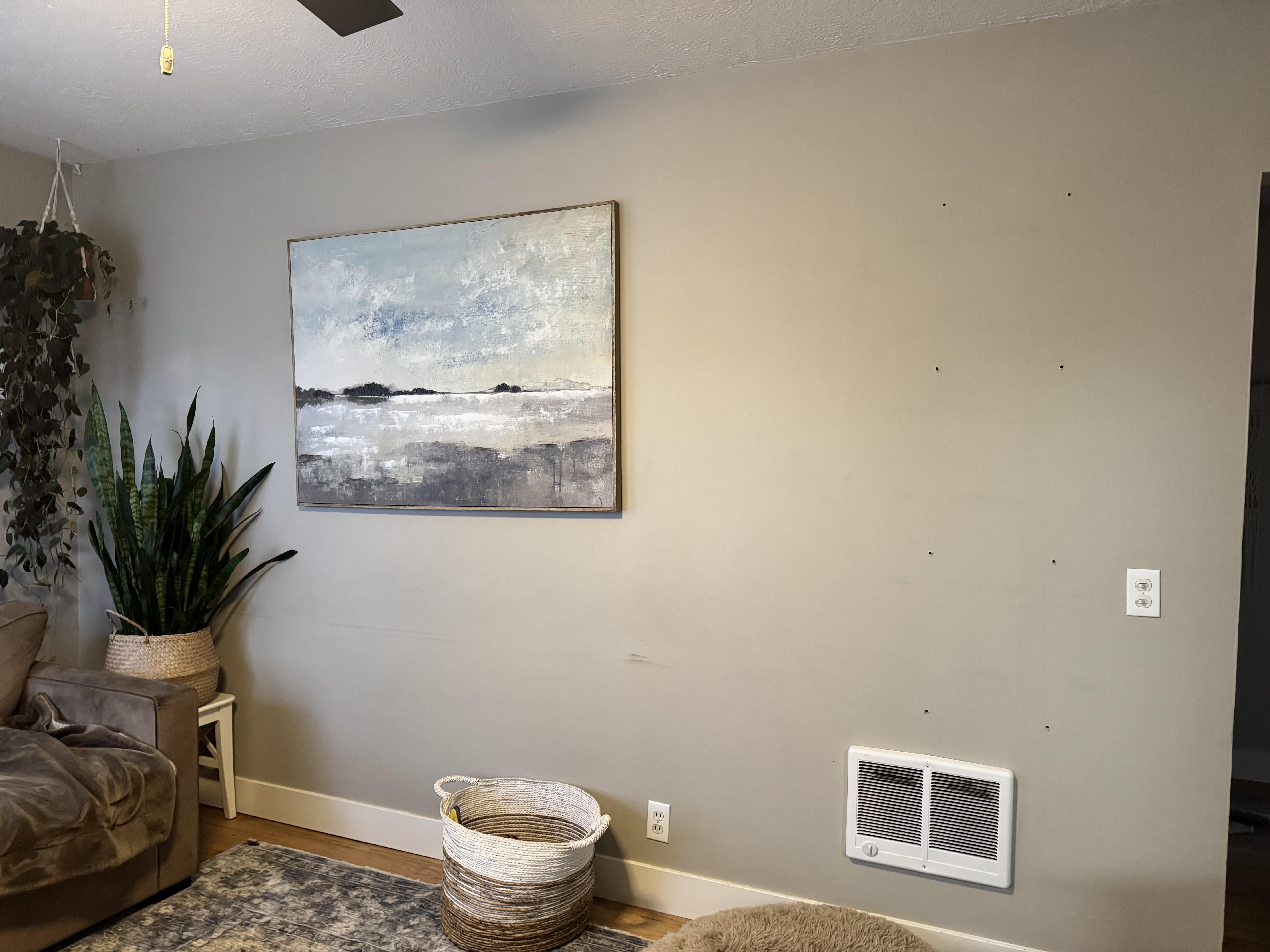 The large piece of art you see used to be centered over the sofa. I had shelves to the far right to help it look more centered on the wall too. I removed the shelves since I never put anything on them and to declutter the space. I need to fill holes and repaint the wall.