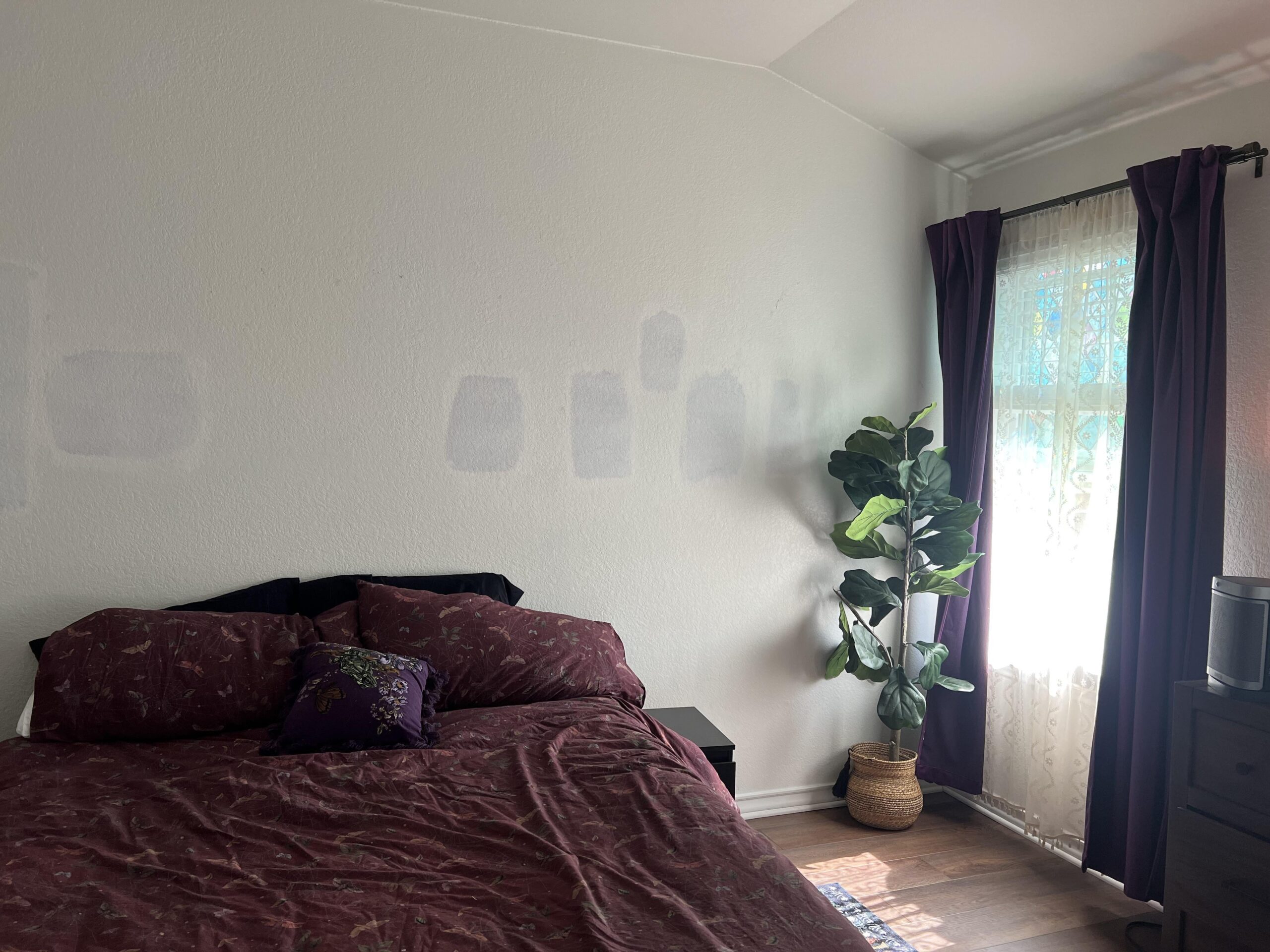 any ideas for paint colors? i want a moody cozy room. i so far have done a ton of samples of deep purples. the swatches on the walls are those with kills over it. any other ideas before i commit? it was almost toooo dark but the lighter i go it becomes grey which i dont like. husband doesnt like pink undertones and i dont like white. TIA! this room is south facing and usually gets a lot of sun. just a cloudy day today! as for the wall, i need something to put there. i know i need a headboard and more pillows. ideas welcome!