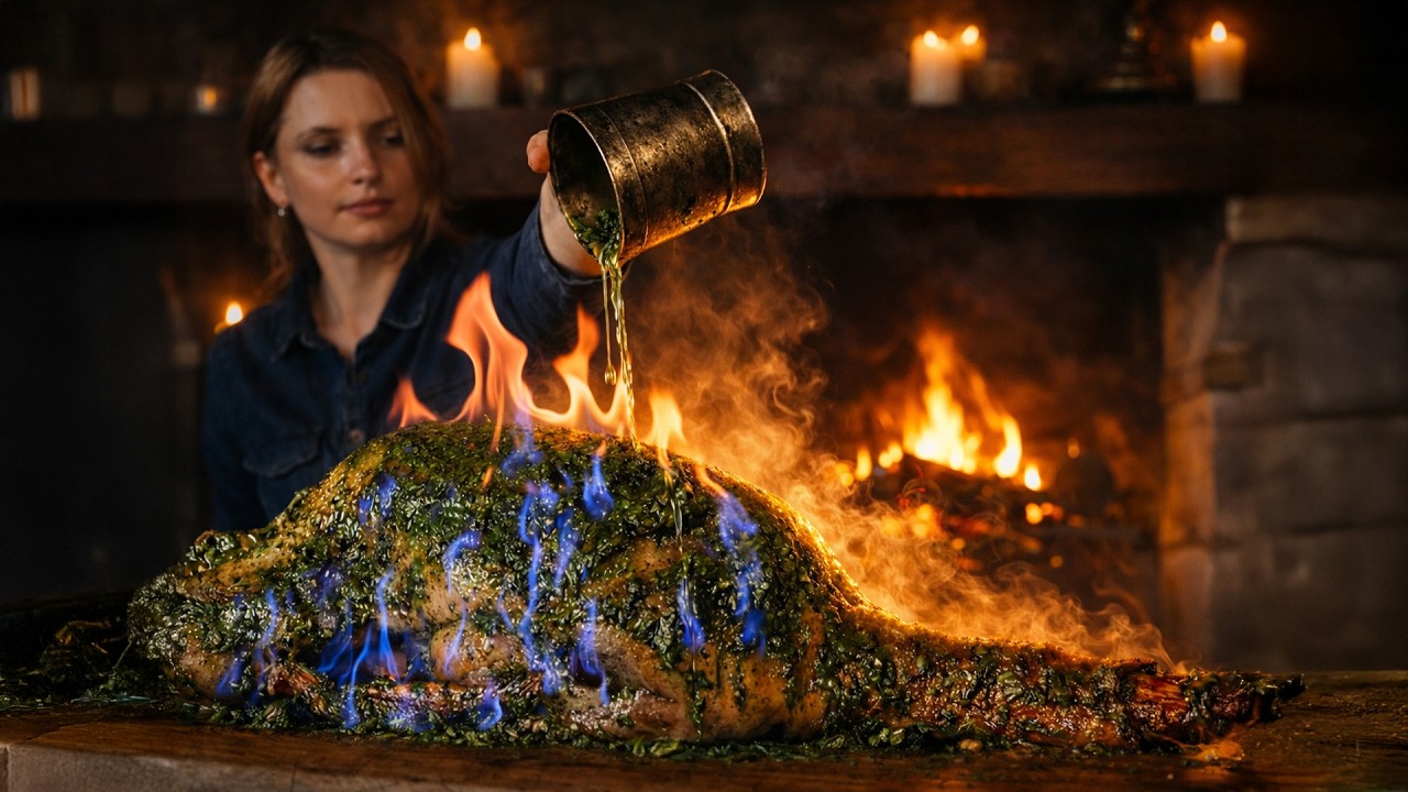 Slow roasting by the old stone hearth, green herbs melting into the skin, warm evening light, and the profound silence around the flames.