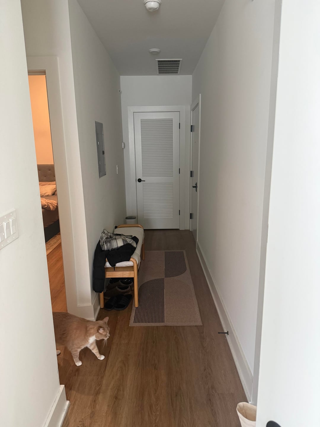 Which side for entry bench, pic 1 or 2? Front door is the door to the right. Door straight ahead with slats is unused utility closet.