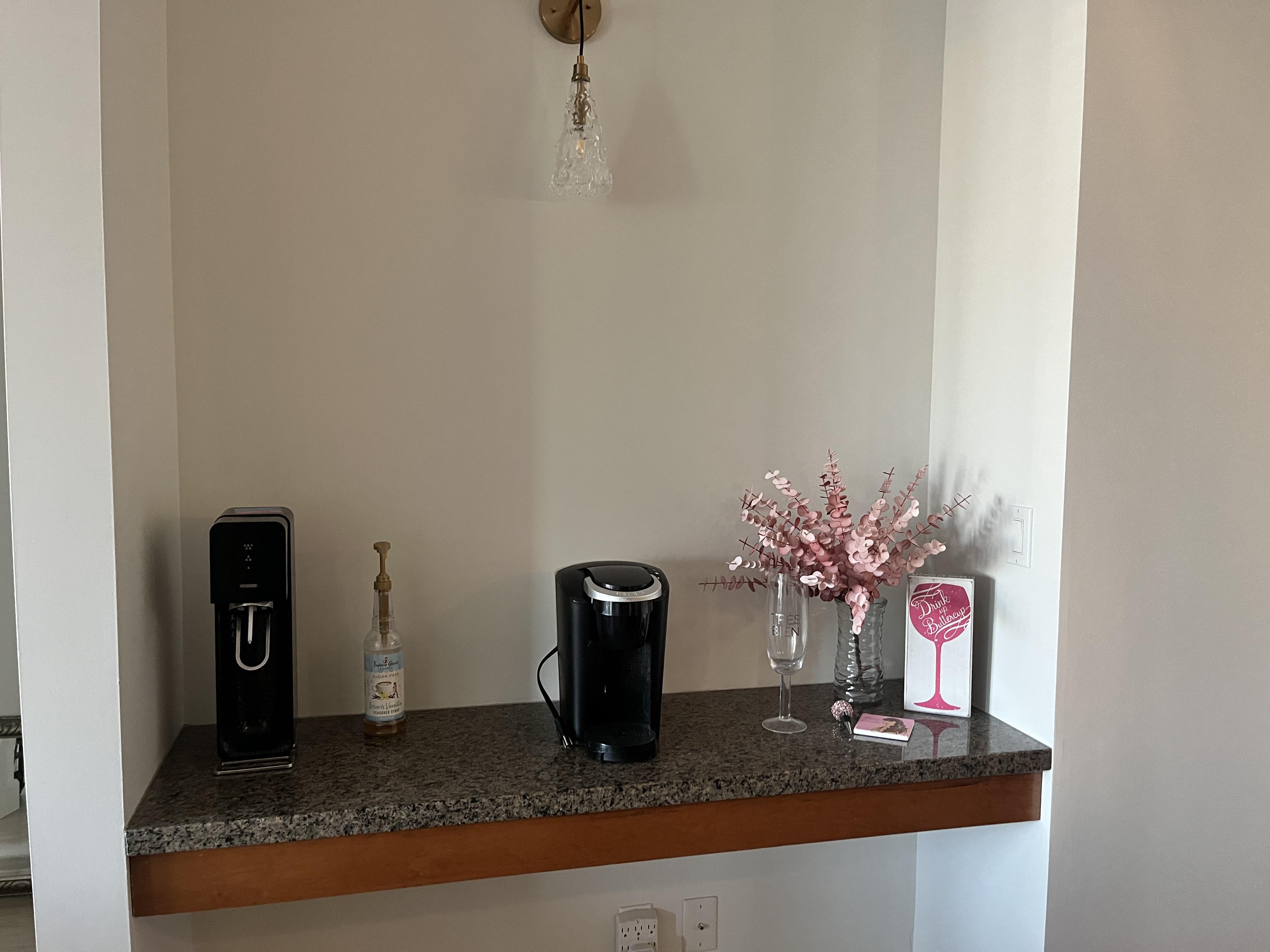 Some coffeehouse-subject vintage/antique posters above (2 big or 3 smaller) would be neat. And maybe a wallpaper (perhaps cleanable) at least at the back? Or you could do a backsplash as coffee even Nespresso but definitely frothed milk can be messy. The light is what spurred the vintage/antique posters thought, so you could also do wallpaper as an accent above, maybe cleanable, in lieu of backsplash?