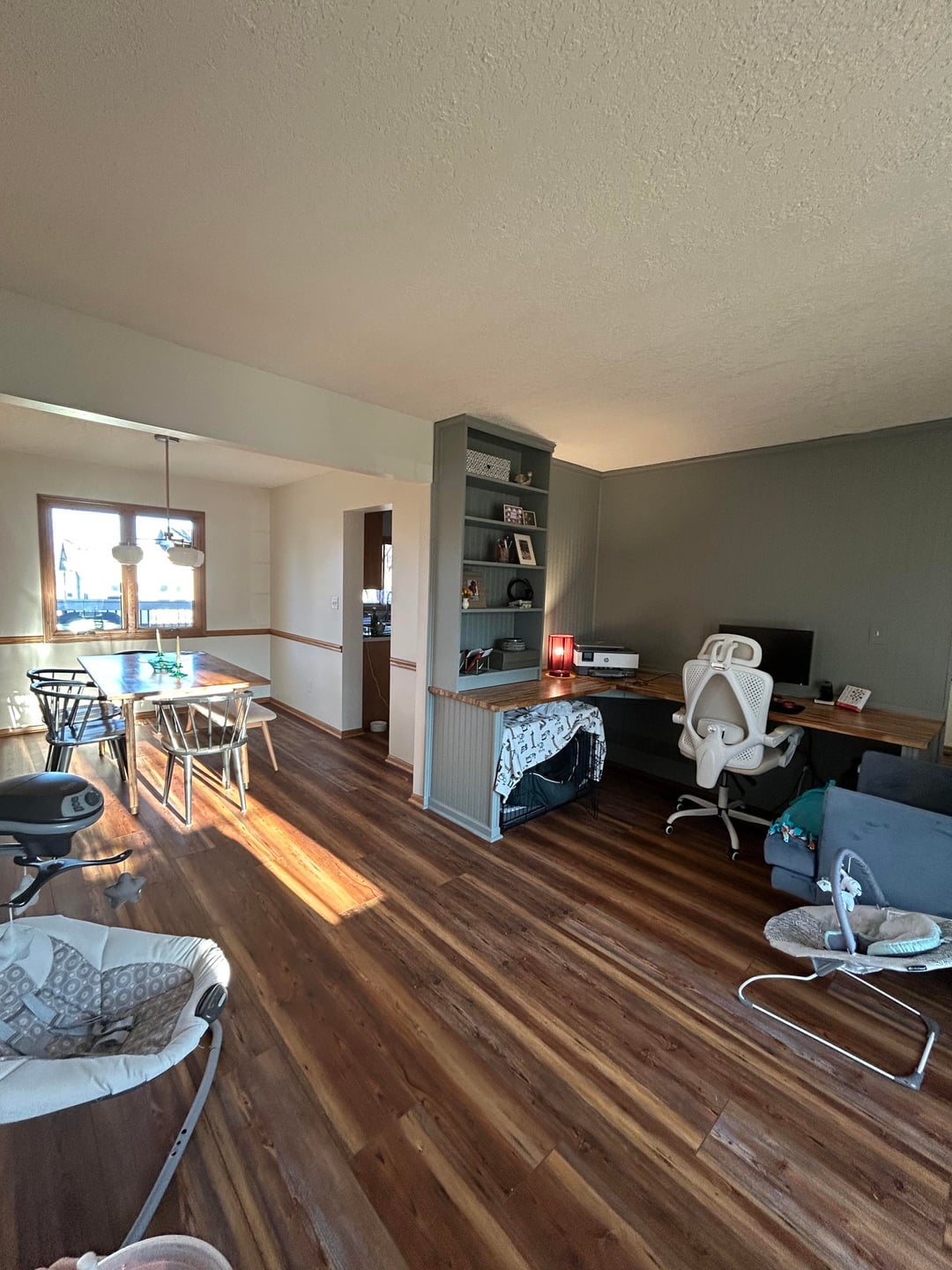 Paint and paint the trim. Carry the wainscoting from the desk into the dining room. Go from there