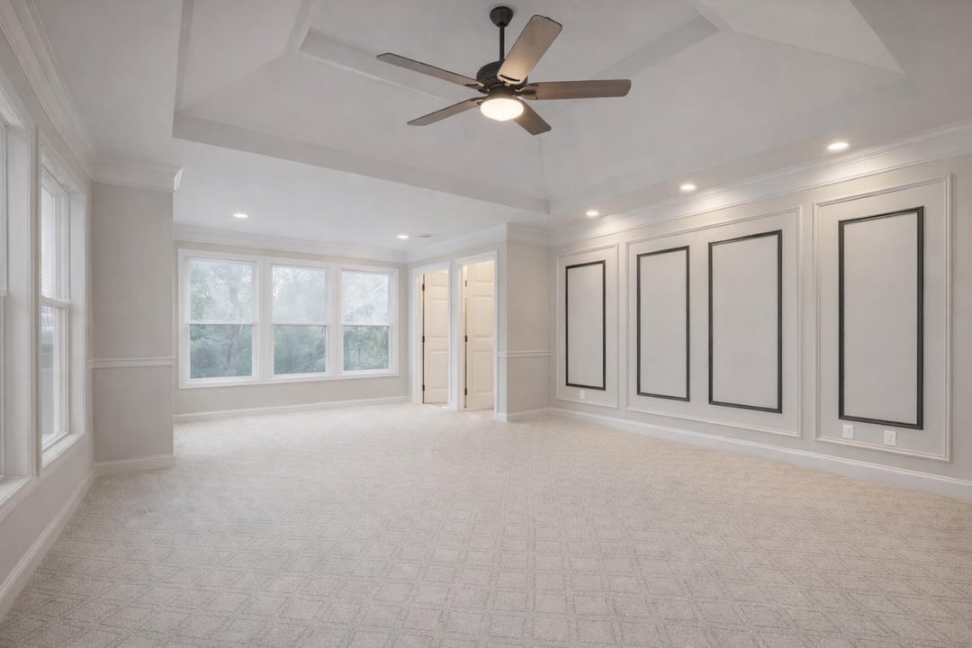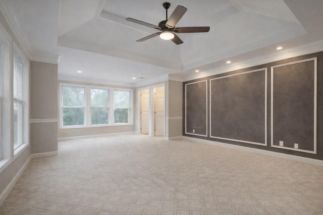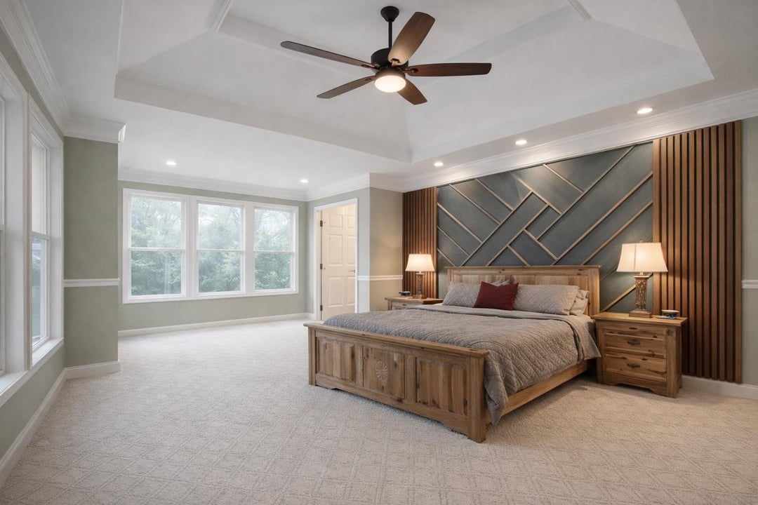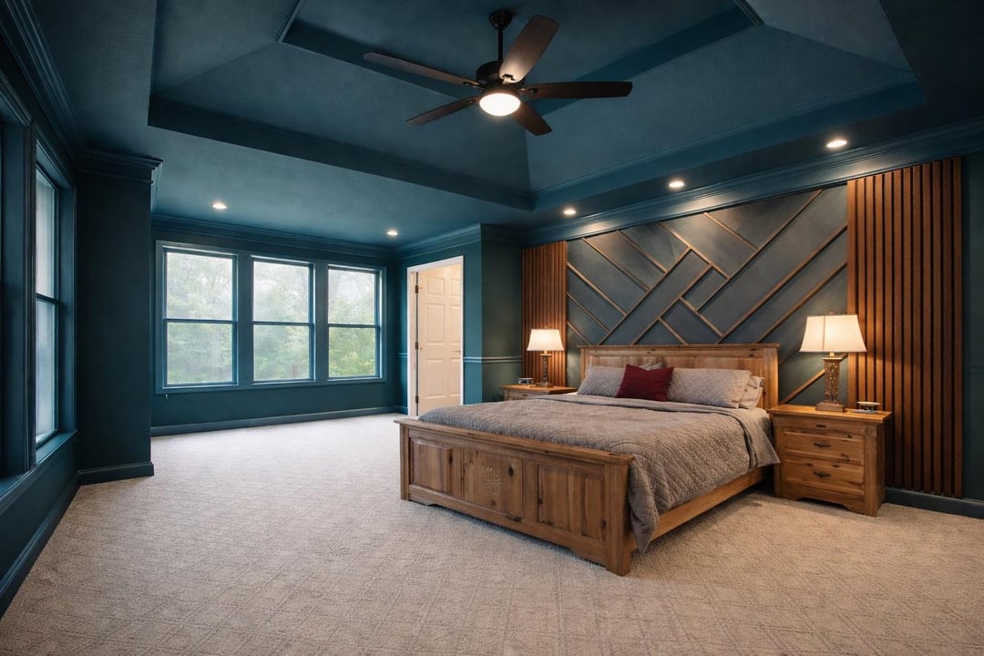 We’re changing the carpet and painting. Also adding an accent wall. We want something bold but don’t want to make a mistake we’ll regret later. The picture I’m showing is what the bedroom looked like when we bought the house. Currently the walls are grayish and light blue on the bottom. Trim is white. I’m including a picture of what I’m going for but I don’t know if the trim should be a different shade or if the walls should be lighter or darker than the ceiling.