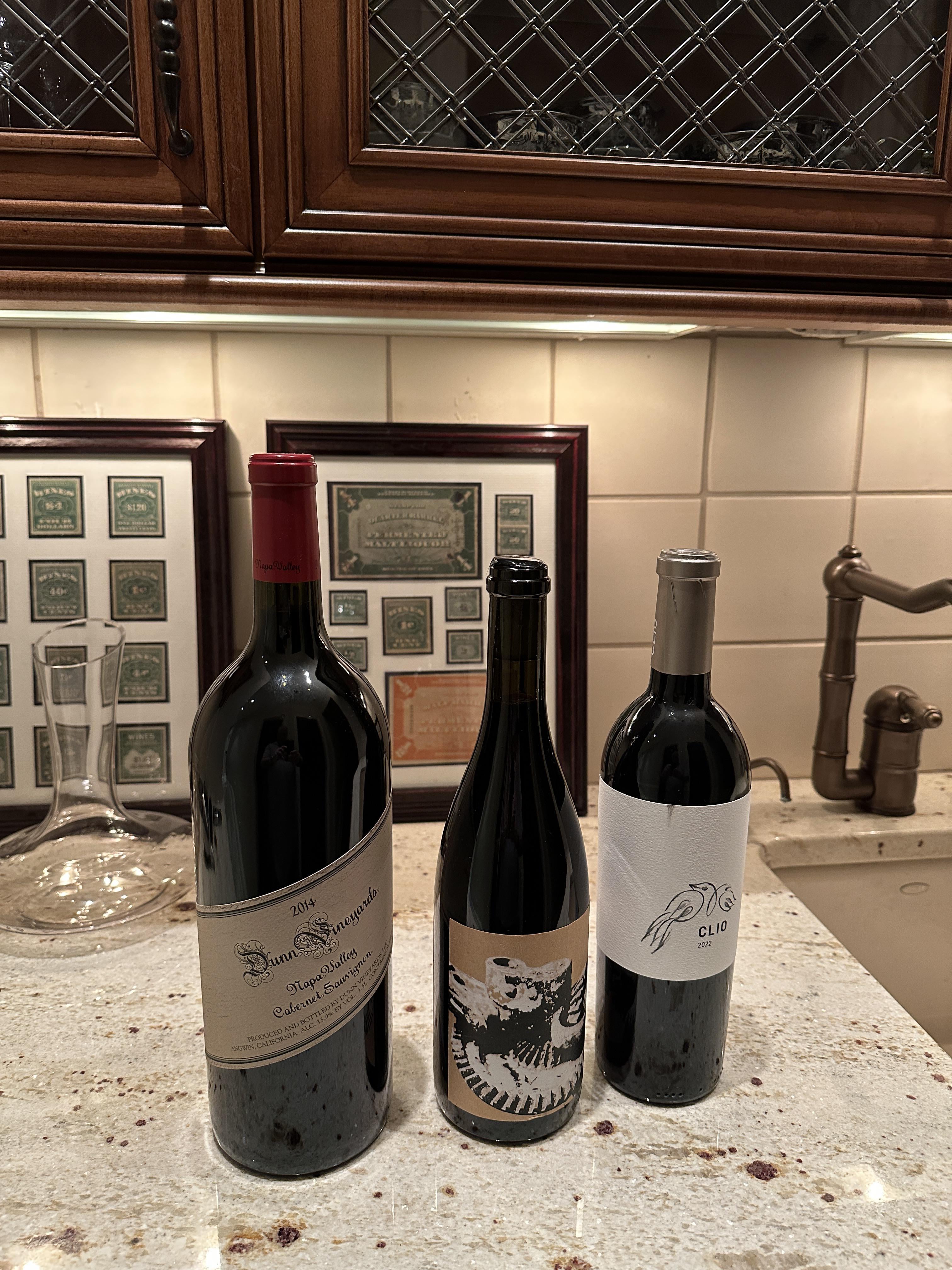 2014 Dunn Napa Cabernet is going to need some time to loosen up. Not as good as the 100% Howell Mountain variant but still excellent. Herman Story Bien Nacido Syrah is young, 2022, but IMHO is great after at least an hour in the decanter. I will say any HS is definitely an acquired taste. The Clio is also young but again I think is great after an hour or so.