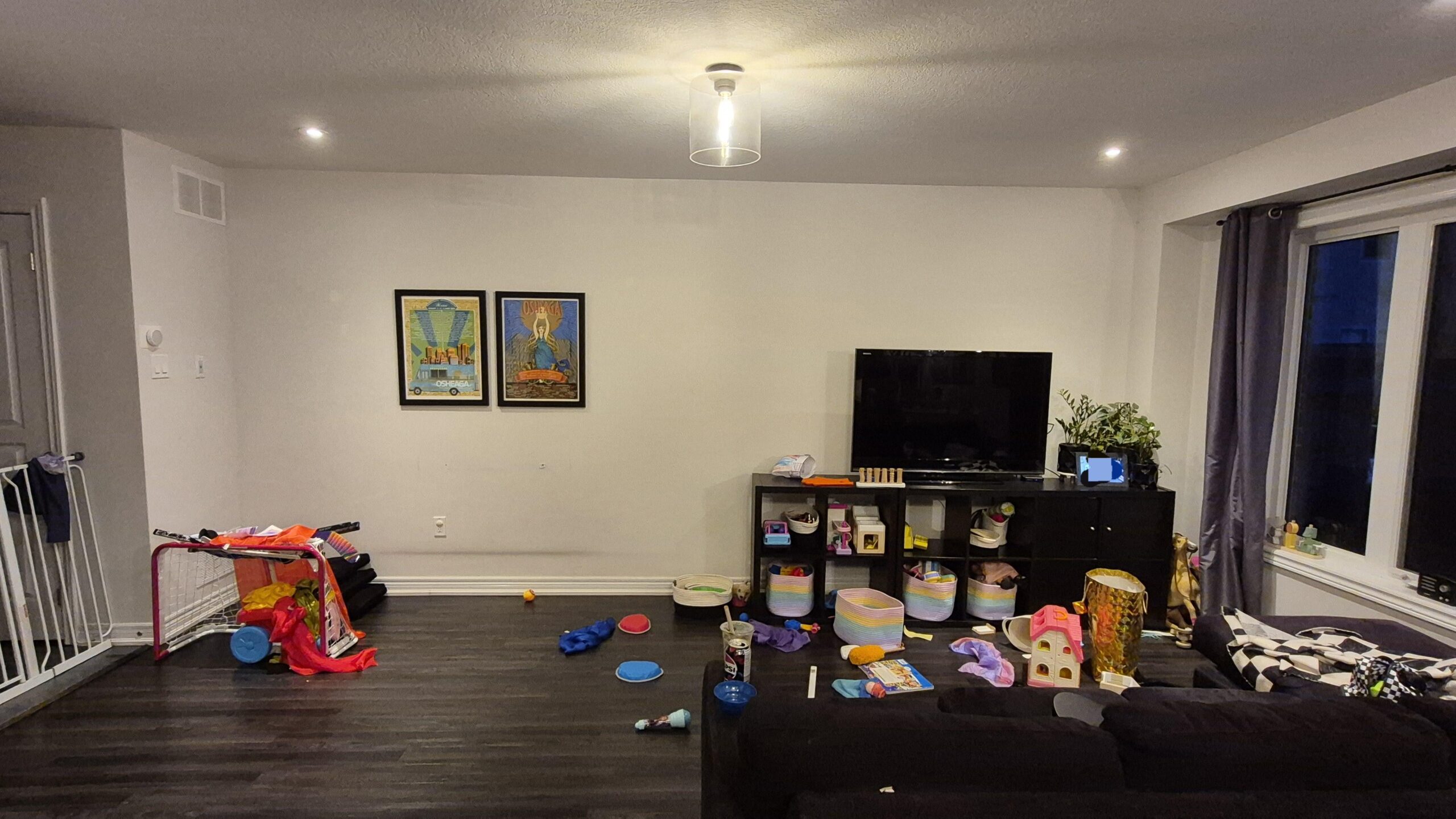 We are considering renovating our living room wall to make it more visually appealing and incorporate built-in storage. Symmetry suggests the TV should be mounted in the centre, however it is lined up with the couch placement (lower right bottom) as that is what works with the open concept kitchen that is beyond the photo border. In an ideal world we'd mount the TV, likely over an electric fireplace/mantel, but can't figure out if that would look terrible being off-centre in the room.