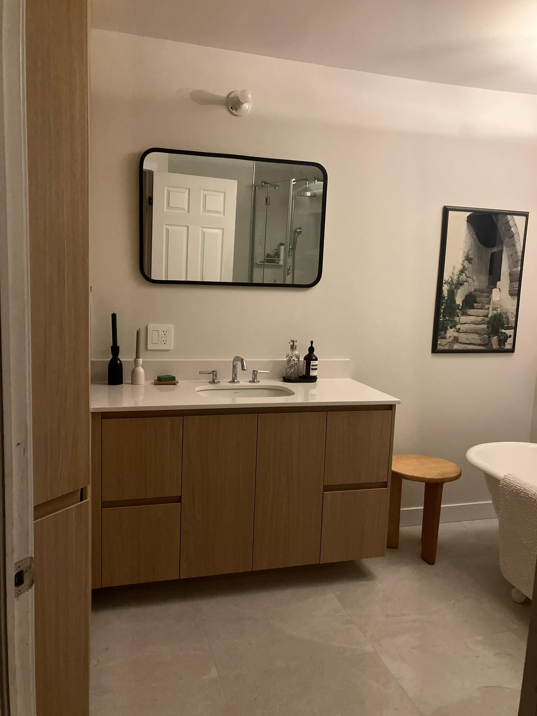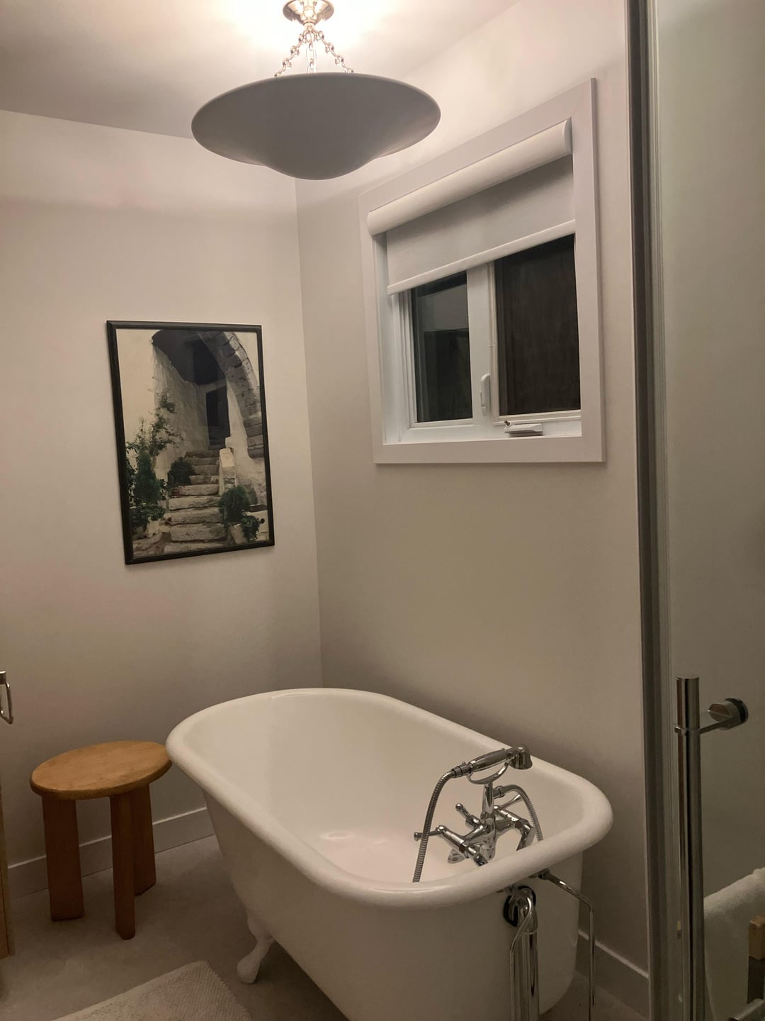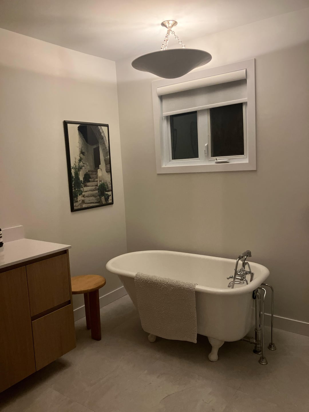 We recently renovated our bathroom and although I’m in love with it, it doesn’t have the warmth I was hoping for. Any ideas? I’d also like to know your opinion on the the « bow » of the tub facing the wall- I realized too late that although it’s practical when bathing to not be staring at the wall, Im thinking the at maybe it have been flipped around, with the drains against the wall and the « bow » of the tub exposed. It’s too late anyways, but I’d love your opinions!