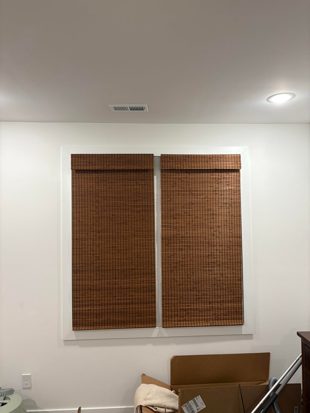 If you can’t do full width, the first photo looks better. It gives the illusion of two separate windows instead of one with two too-small shades on it.