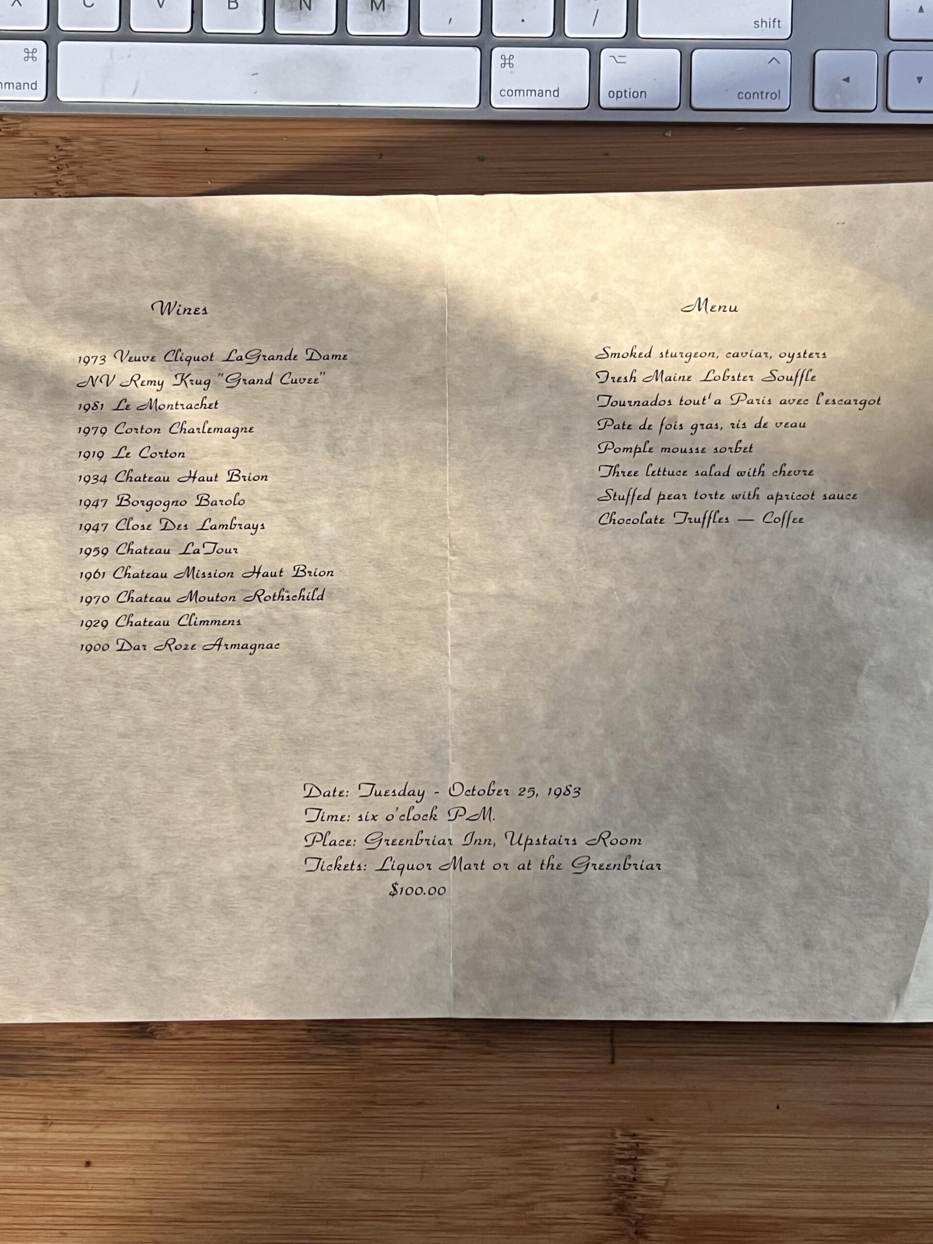 Wow great menu. Even for $100 back then is a crazy deal. Id kill to go to this dinner haha