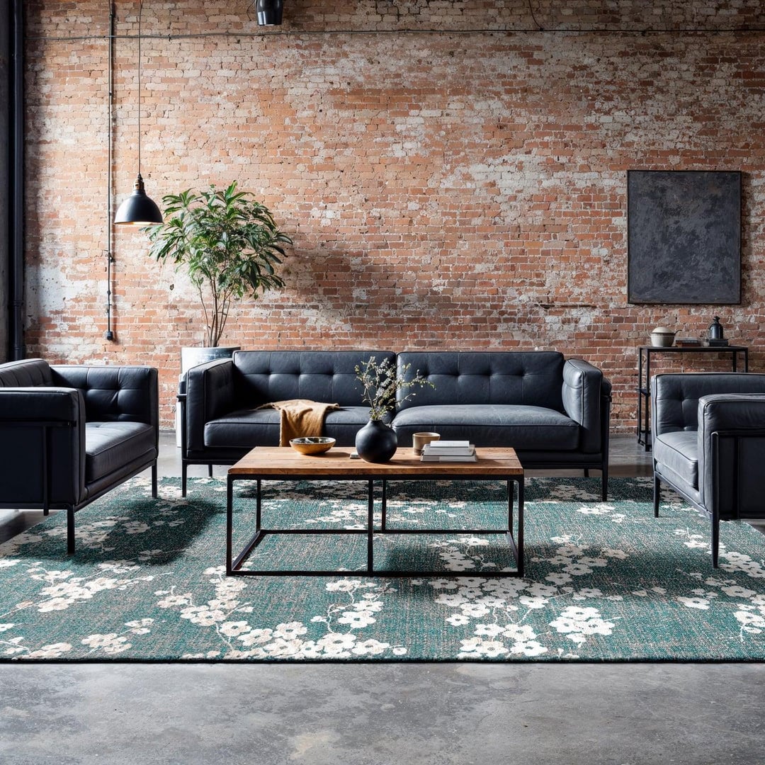 I had the same concern about it feeling heavy, but looking at it again, I actually think it’s a great choice. The white pattern in the rug really lightens it up, so it doesn’t feel like too much turquoise next to the couch.