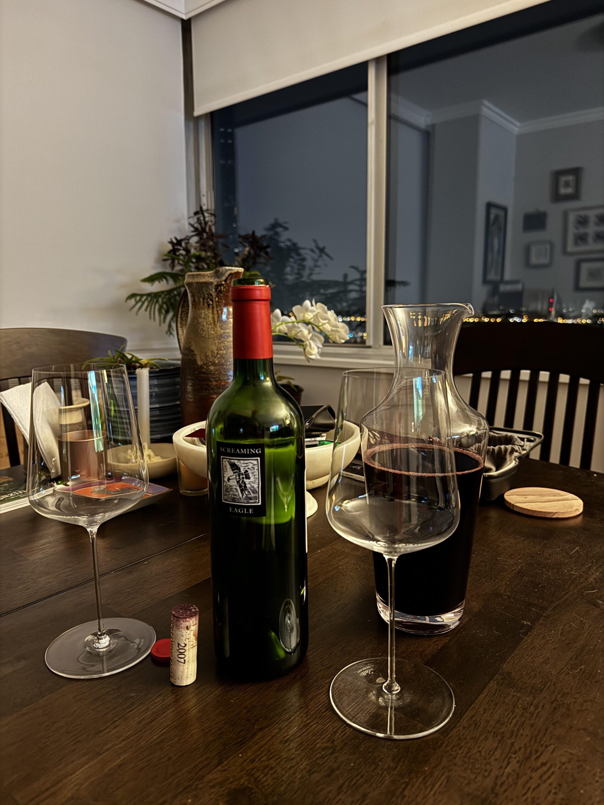 Husband and I decided to stay in and lay on the couch with our dog for Valentine’s Day, and what better way to enjoy a romantic night in than with an ‘07 Screamer. Gentle decant at 6pm, had our first glass at 7p, and slowly made our way through it over the course of the next two hours.