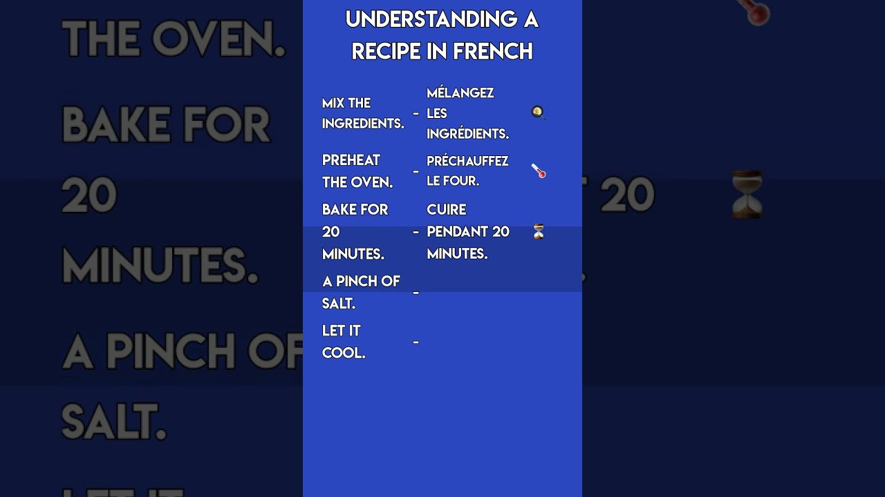 Want to try a French recipe? Learn the basic verbs and phrases you’ll find in a cookbook, like ‘preheat the oven’, ‘mix the ingredients’, and ‘a pinch of salt’. #LearnFrench #FrenchCooking #Baking #FrenchVocabulary bakingbaking in frenchCookingFranceFrenchfrench foodfrench for cookingfrench kitchen termsFrench recipeslearn frenchReadReciperecipe vocabulary frenchVideoVlogVocabularyYouTubeWrite A CommentYou must be logged in to post a comment.