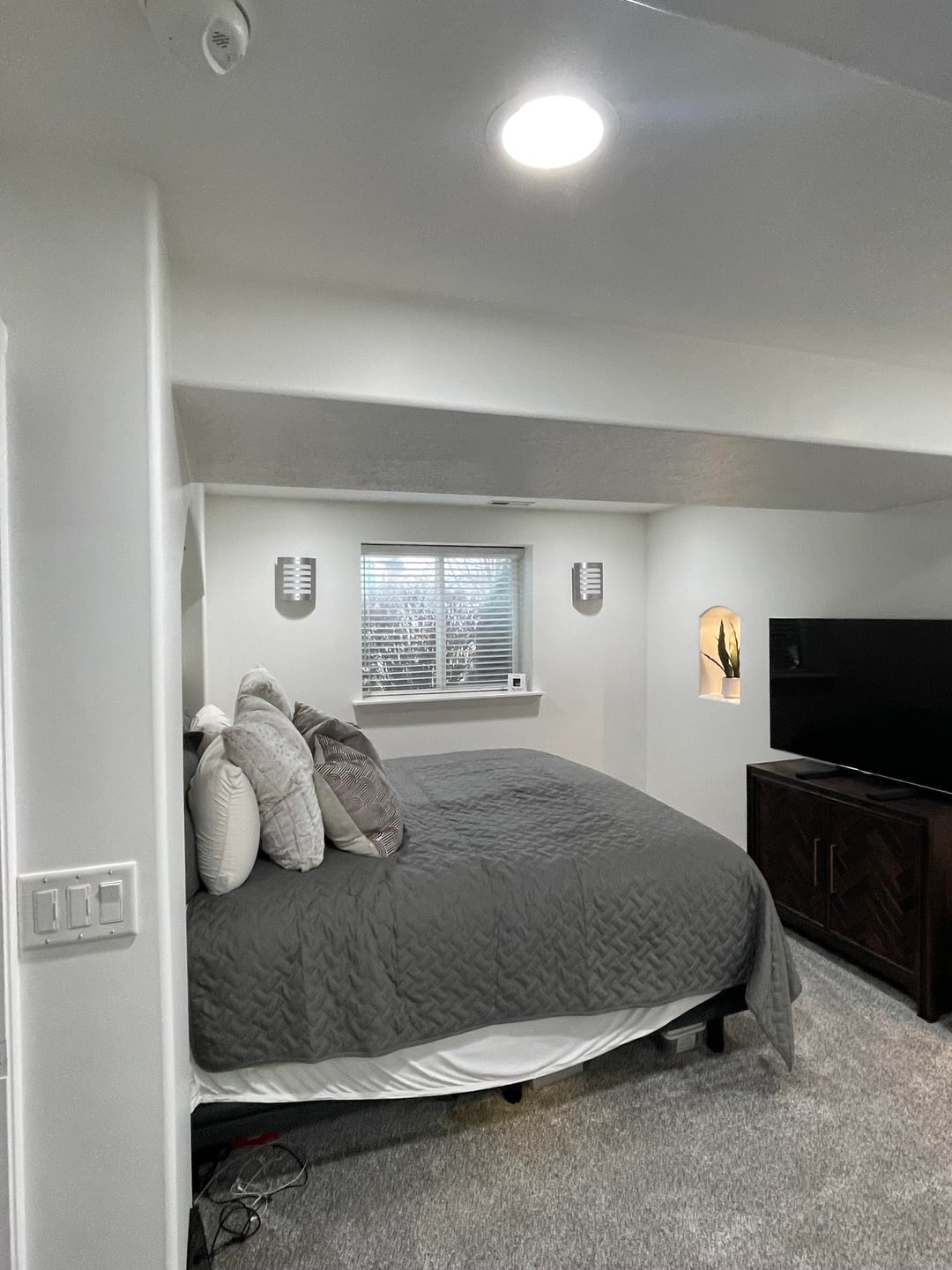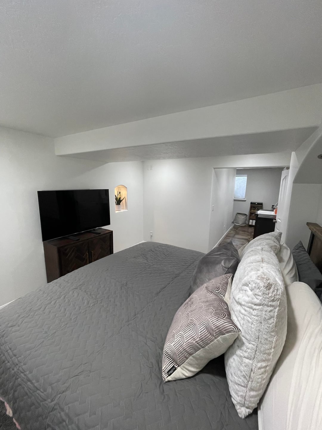 Just had the room painted white with new carpet. How would you juge up this room? Do I need an accent chair or bench on the wall next to the bed? Thinking of the color dark green. What about the wall down the bathroom hall? Ideas please. I’m not good with this stuff, but with Presidents’ Day sales, I want to advantage of that. Thank you in advance.