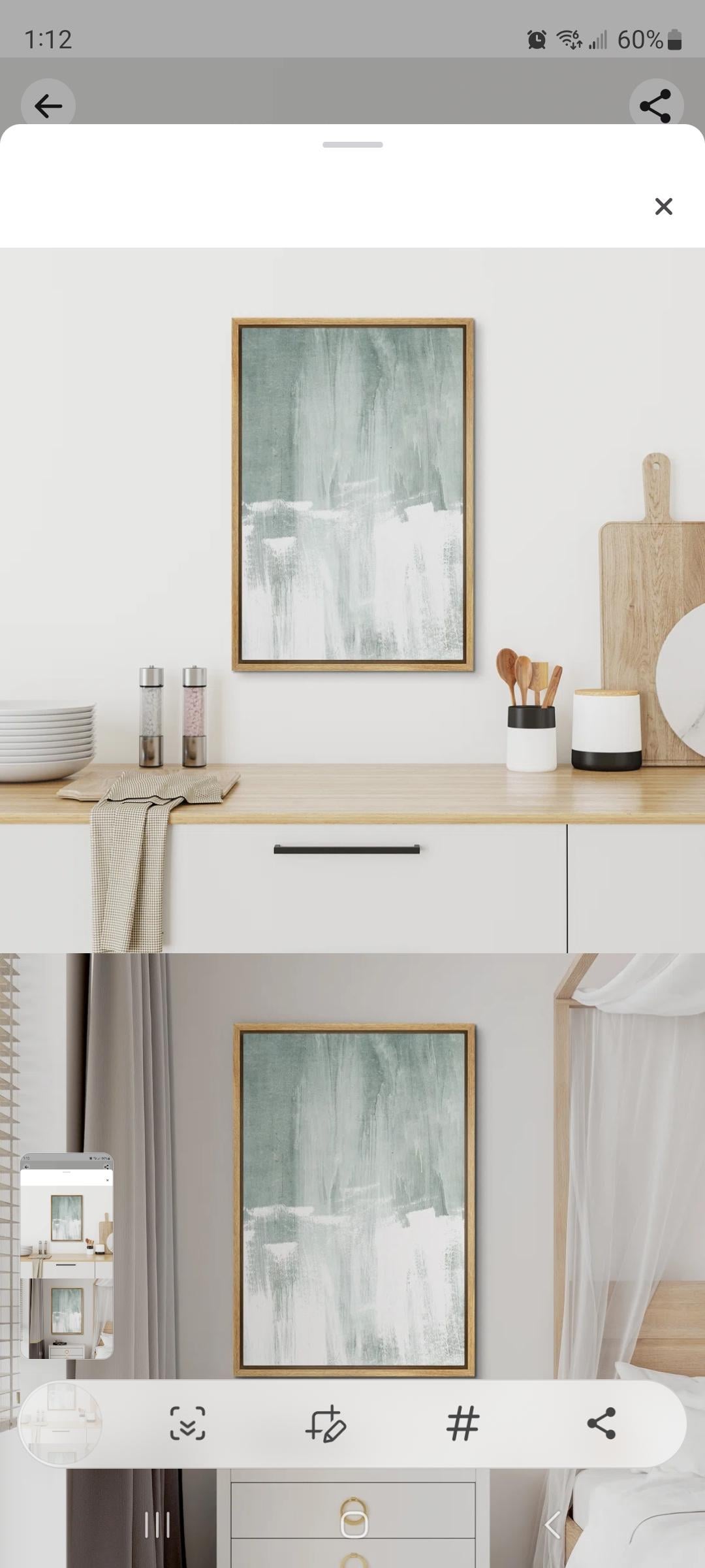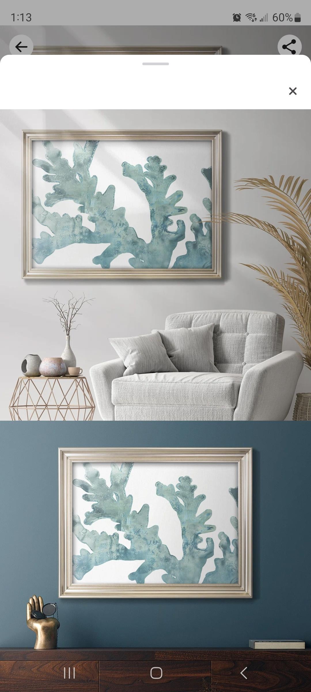Looking for art to put on the inside wall. Right now it's just big and empty! Size preference is 24" tall and 36" wide. I've added screen shots of some of the current options, but nothing seems quite right. So far, the favourite is the coral as it seems to fit with the shapes of the wallpaper. Last photo of the framed Matisse is what's behind the toilet. Any suggestions on what might look good are welcome!