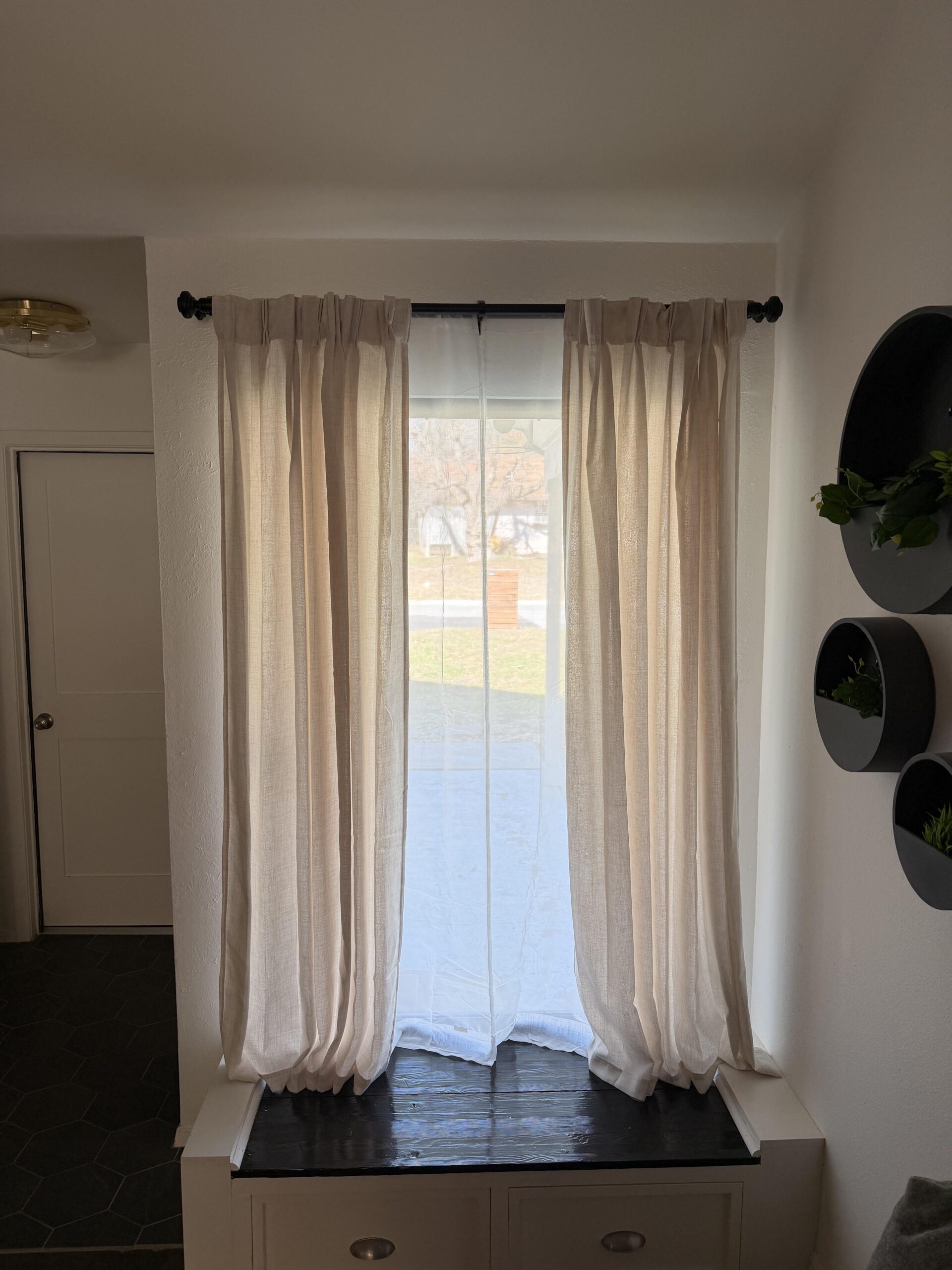 The pooling look on the cabinet surface makes it looks like a mistake in the rod height. Not sure what look you are going for here. Kind of alsolooks like you need another sheer panel so sheers can be gathered too. Color if you like it is fine but if you hung them so they just touched and didn’t drape onto the white surface L & R would look intentional and neat.