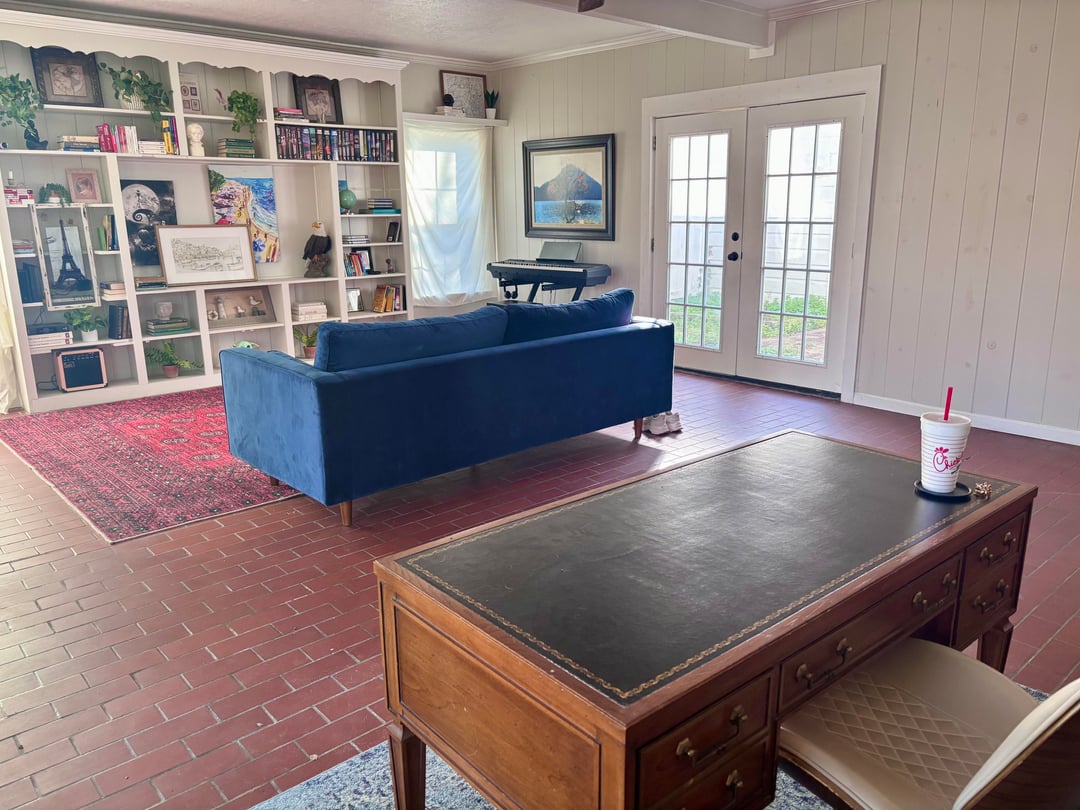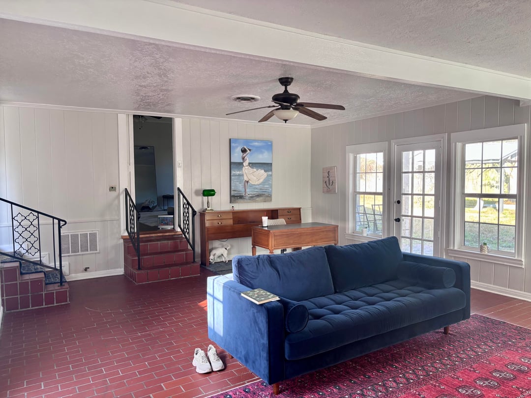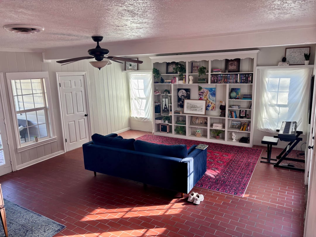 The room is large (about 24×27 ft) with a big red rug (14×12). It also has some awkward double stairs that I have to work around for now. I’m keeping my current furniture and rugs but want the space to feel cozy, warm, and a bit eclectic/vintage.