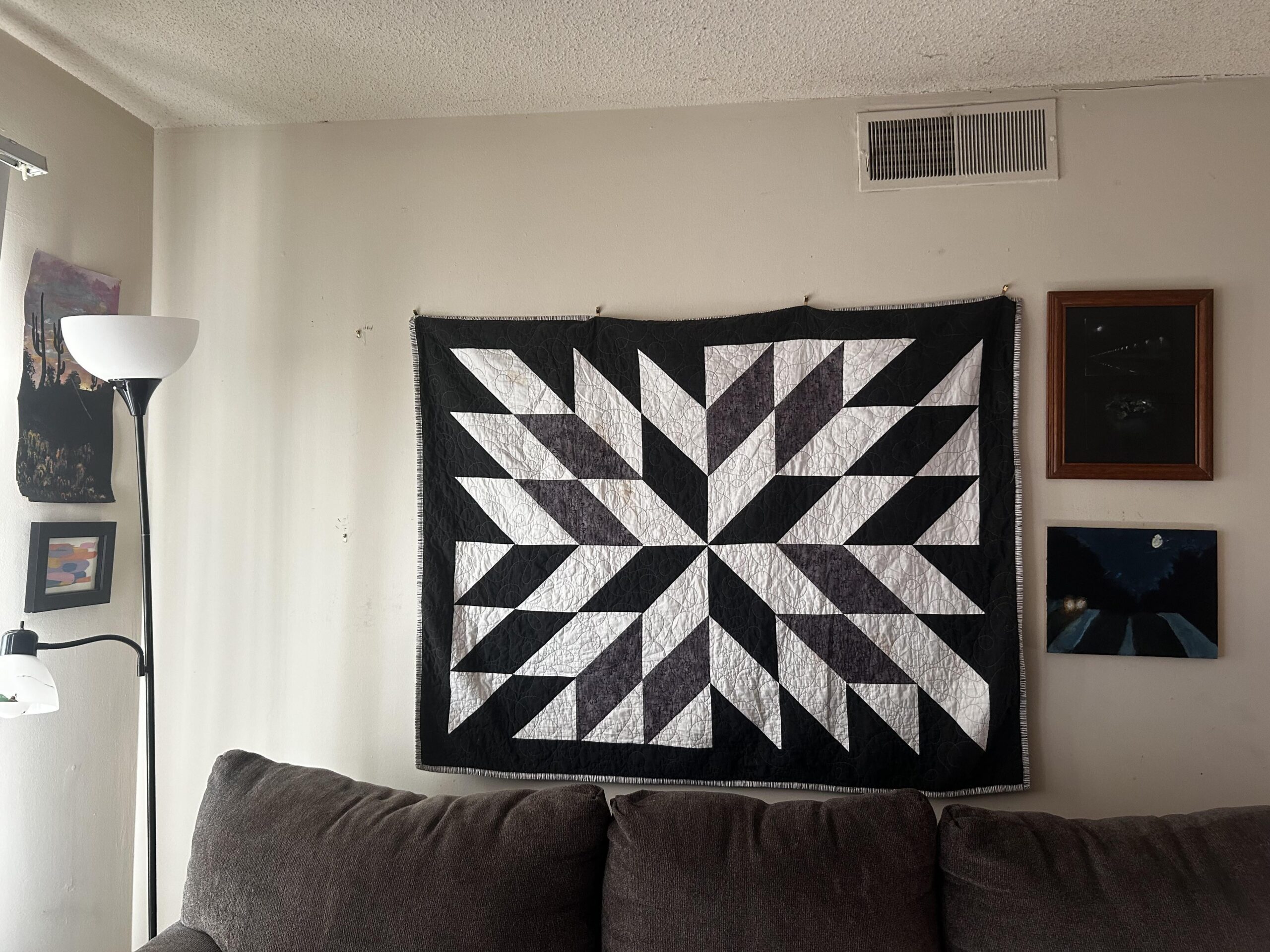 I am thinking of adding two color coordinating pieces of art of pictures of similar size as to the left side and then four small pieces above the quilt. I am completely open to additions or suggestions or even complete makeover of the wall. Trying to color coordinate with both the darker colors on the left side and the bright colors on the connecting wall.
