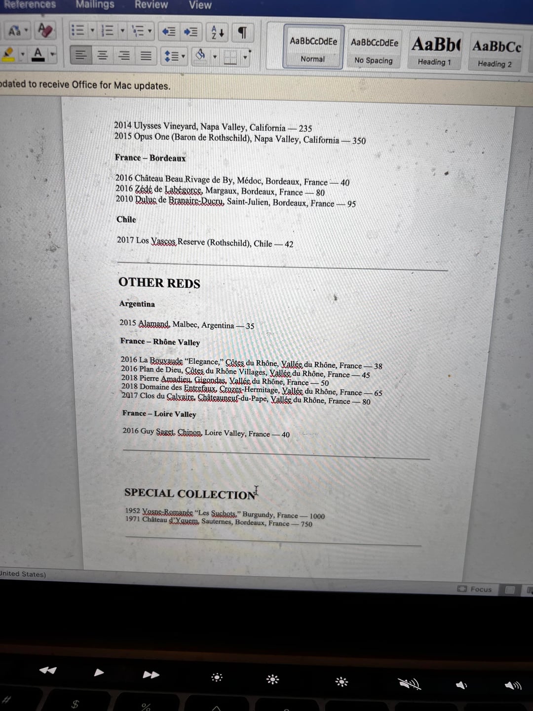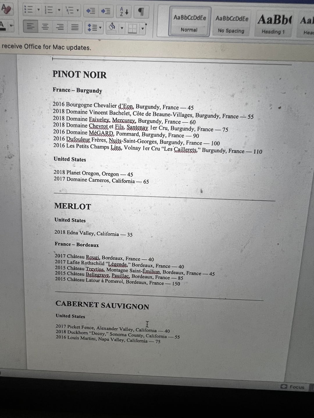 (Copied into word document so it would fit on one page.) the chateau latour a pomerol and the opus one both seem to be priced very well. The 2016 Dufoeur too. Any other recs?by 11777766 Wine 4 Comments AnyLie2121 2 hours ago Screen cleaner would be my recommendation bloks27 2 hours ago I’d rec getting an updated wine list. The vintages and prices are almost certainly from an iteration of this list several years back drf_101 2 hours ago I was confused about how my computer screen got so dirty. My goodness.Consider the 2015 Bellegrave IngenuityStunning755 2 hours ago The 2018 domaine faivley is fantastic. Super silky mouthfeel and a lovely PinotWrite A CommentYou must be logged in to post a comment.