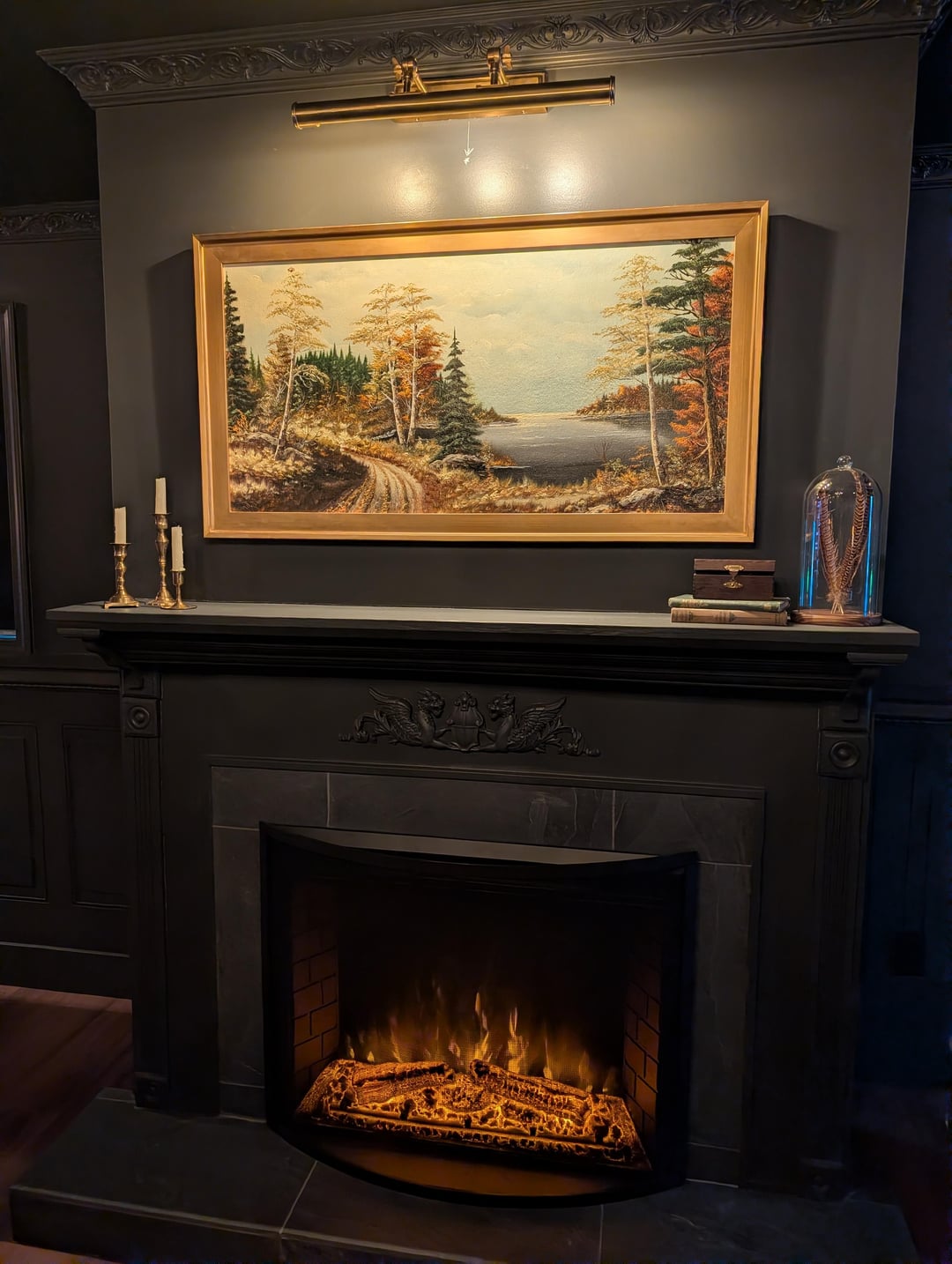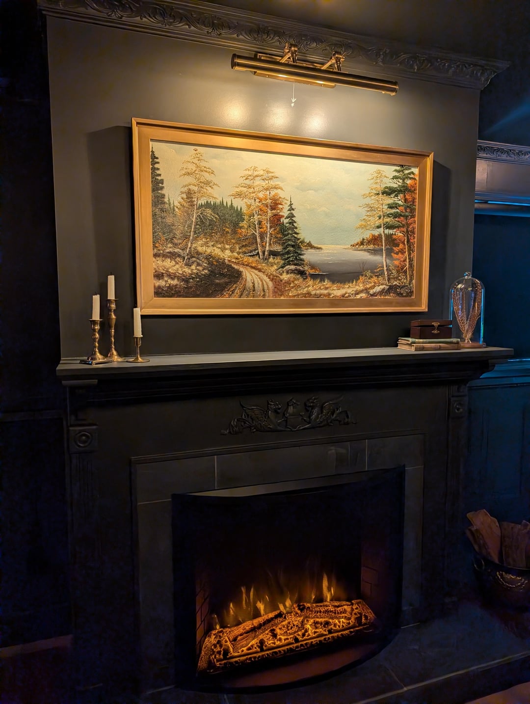 How does my mantle decor look? This is a basement area that has a dark academia/moody English traditional feel. Side note, I’m going to install the painting light lower than where it currently is.