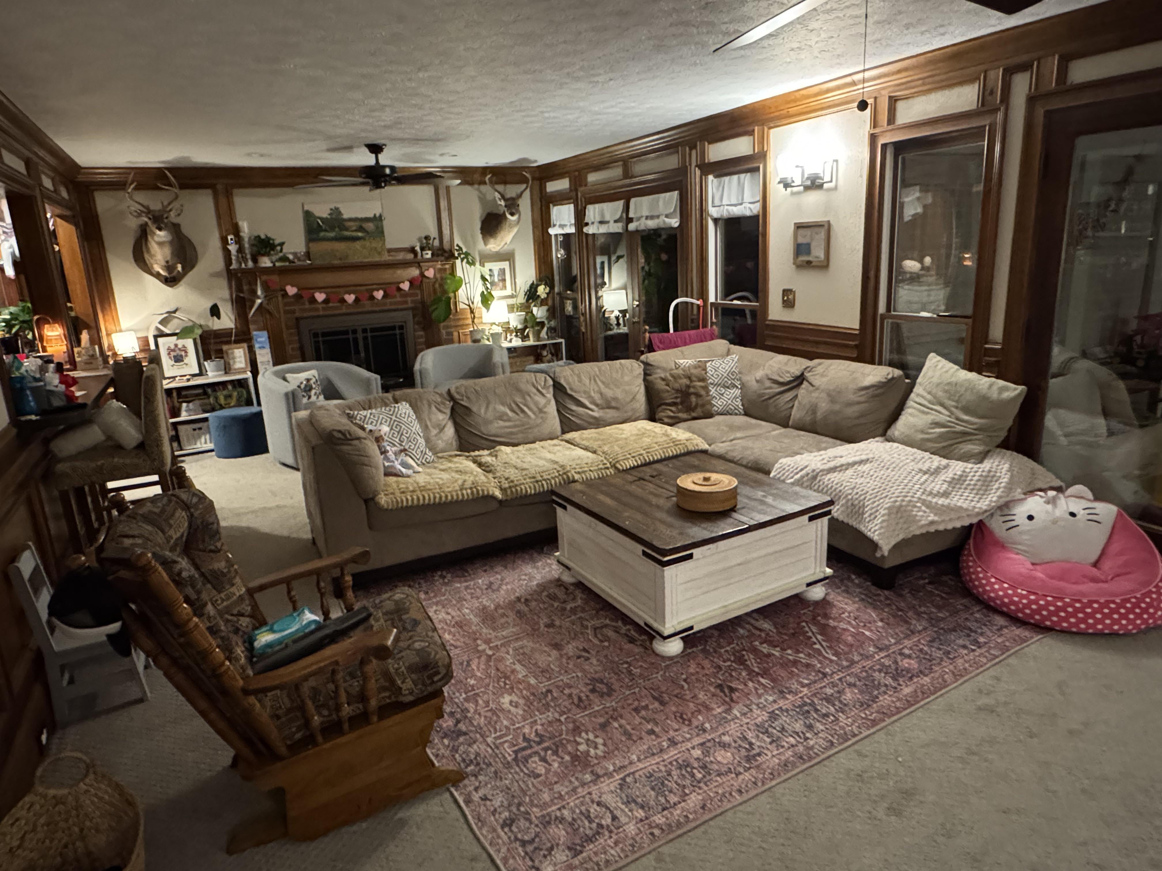 The coffee table and the chairs by the fireplace stick out the most to me—the former is farmhouse and the latter is cool toned modern minimalist. The rest of the room is pretty warm toned and traditional. My advice is to pick one style to start, maybe to match your favorite piece that you definitely want to keep, and go from there. Or, tell us what you’re looking for (cohesion? Functionality? Modernization?) and it’ll be easier to provide specific pointers. I really don’t love the green paint mockup though—it’s just adding another busy layer.