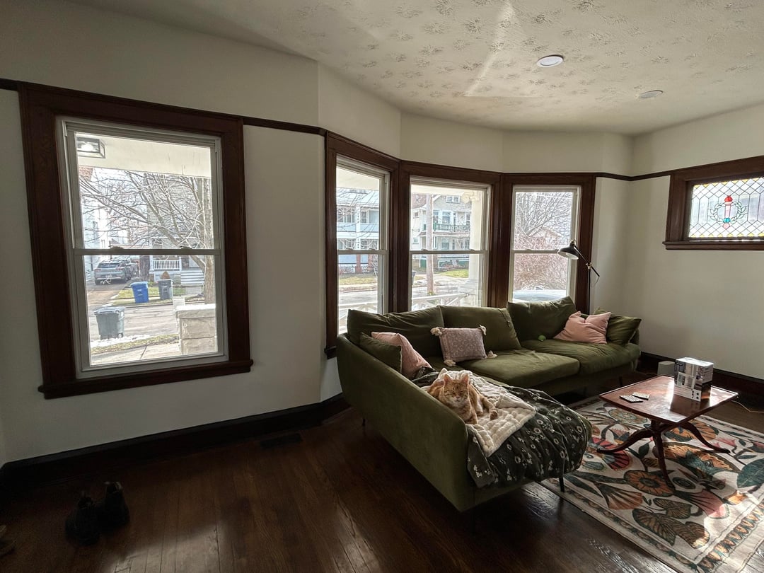 I’m at a loss for how to dress these four windows (the bay window plus the one on the left.