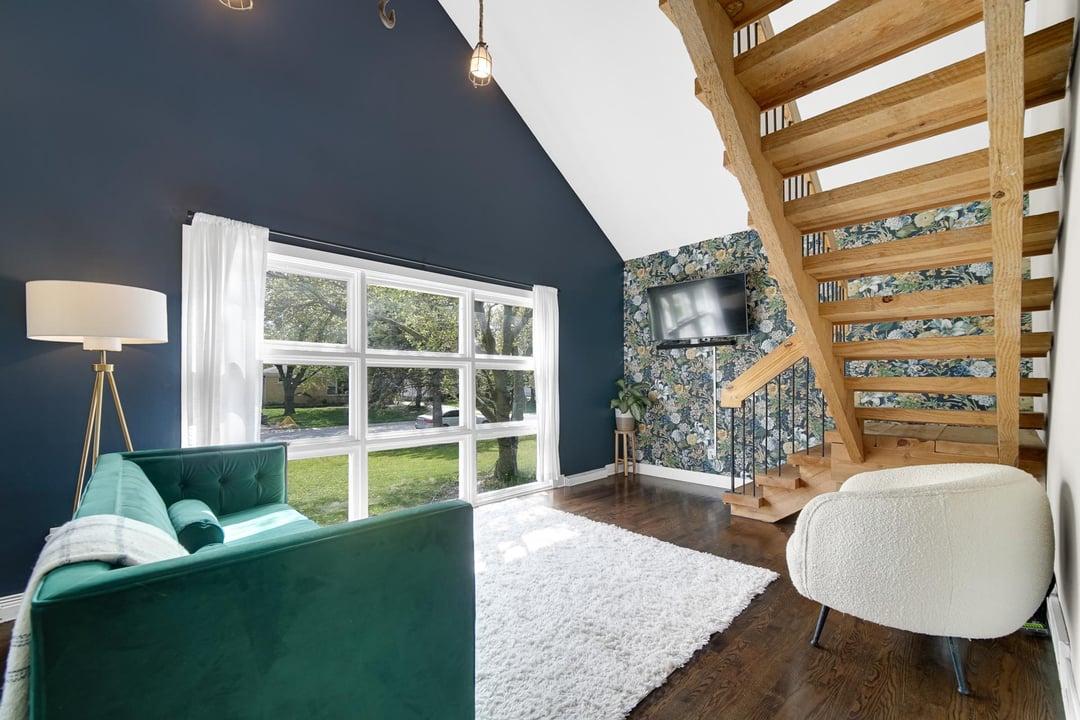Right now, you have one glorious spot of color in a sea of neutrals. Looking good so far, but you need more color in the space to tie the sofa in with everything. Before you decide on colors for more furniture, you need to add art to the space. Be sure at least some of the art has greens and blues in it so your sofa isn’t the only spot of cool color. Once you have the art, the colors for the rest of the living room furniture will likely become clear. I know it’s easy to be in a rush, but take your time and get art you really like. Try art fairs, local maker shops, thrift stores, Etsy, and other outlets for original art. Especially because it is so neutral so far, your art really needs to add character to the space. Good start! Best wishes!