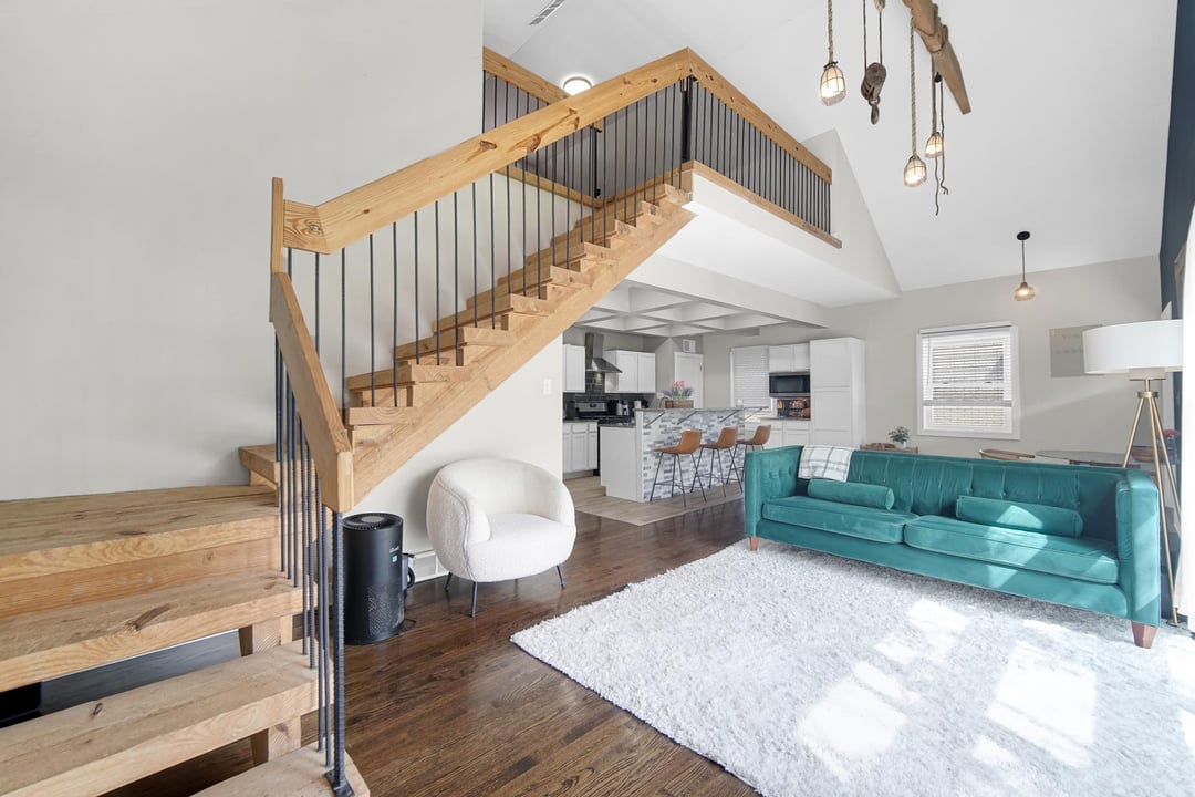 We are getting ready to replace our sofa, and I really loved the dark green velvet. Should I stick with that color for the next sofa, or would a terracotta tie in better with the wood colors and kitchen stools? Or is there an even better color that I’m not thinking of to help unify the entire space?