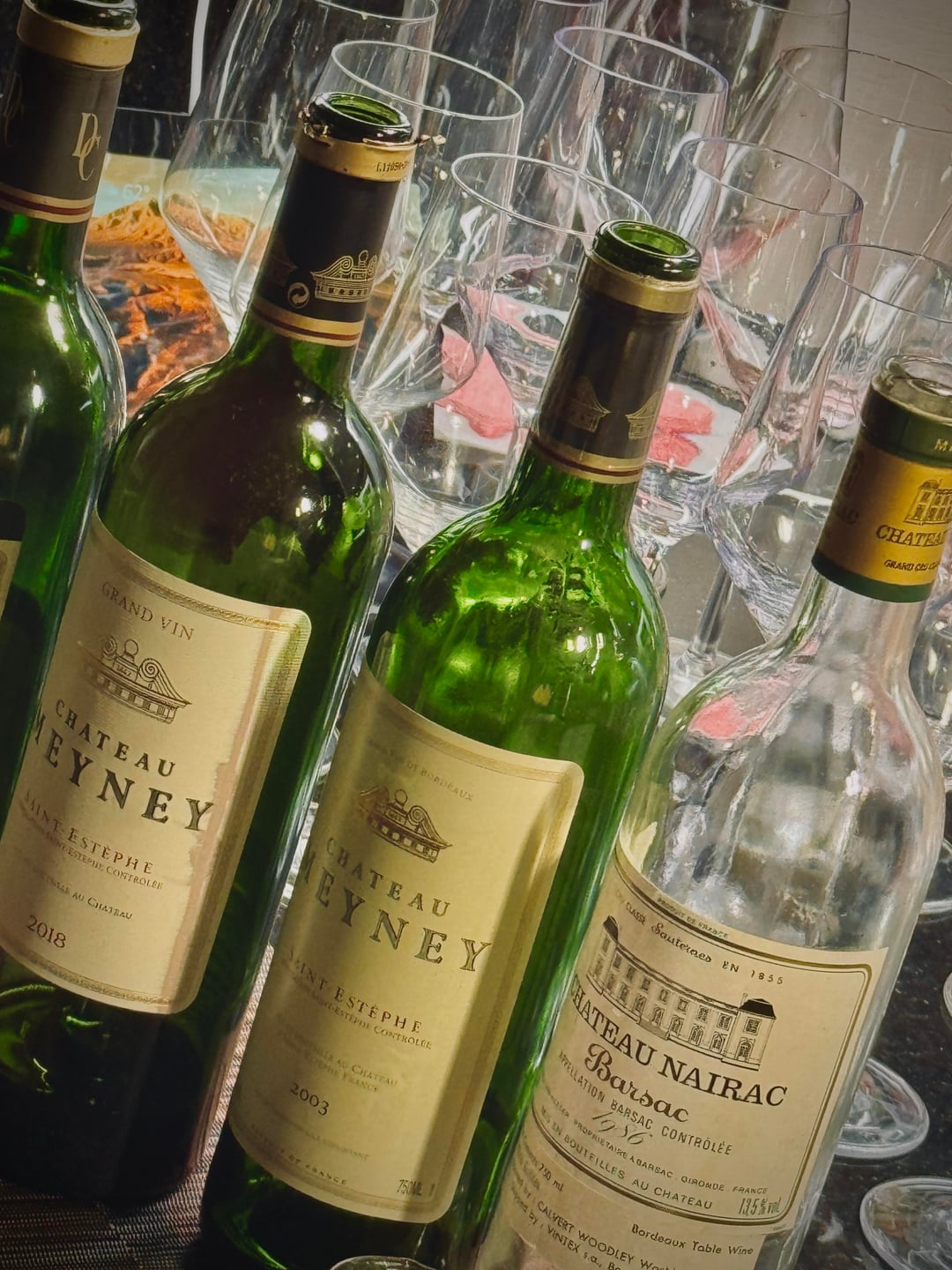 Hosted a Chateau Meyney vertical at my place recently, to introduce my friends to good affordable Bordeaux and how aging and airing out a wine can change its characteristics. As one of my favorite Bordeaux wines at my price point, I ended up deciding to do this when I tracked down the 1988 and 2003 for less than $50/ea, giving me the idea to do a vertical tasting. Paired with charcuterie meats, cheeses, roasted potatoes, meatballs. All stored at 55, but I opened and presented them as follows. Quick notes from me –
