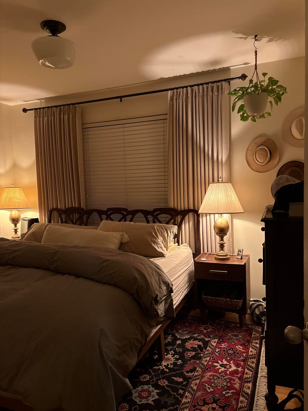 I want a cozy, vintage, warm bedroom vibe and I feel like I’m close. Do my lamps need swapped? Maybe a linen shade? What type of overhead light would you suggest? And what type of window covering outside of blinds would be best?