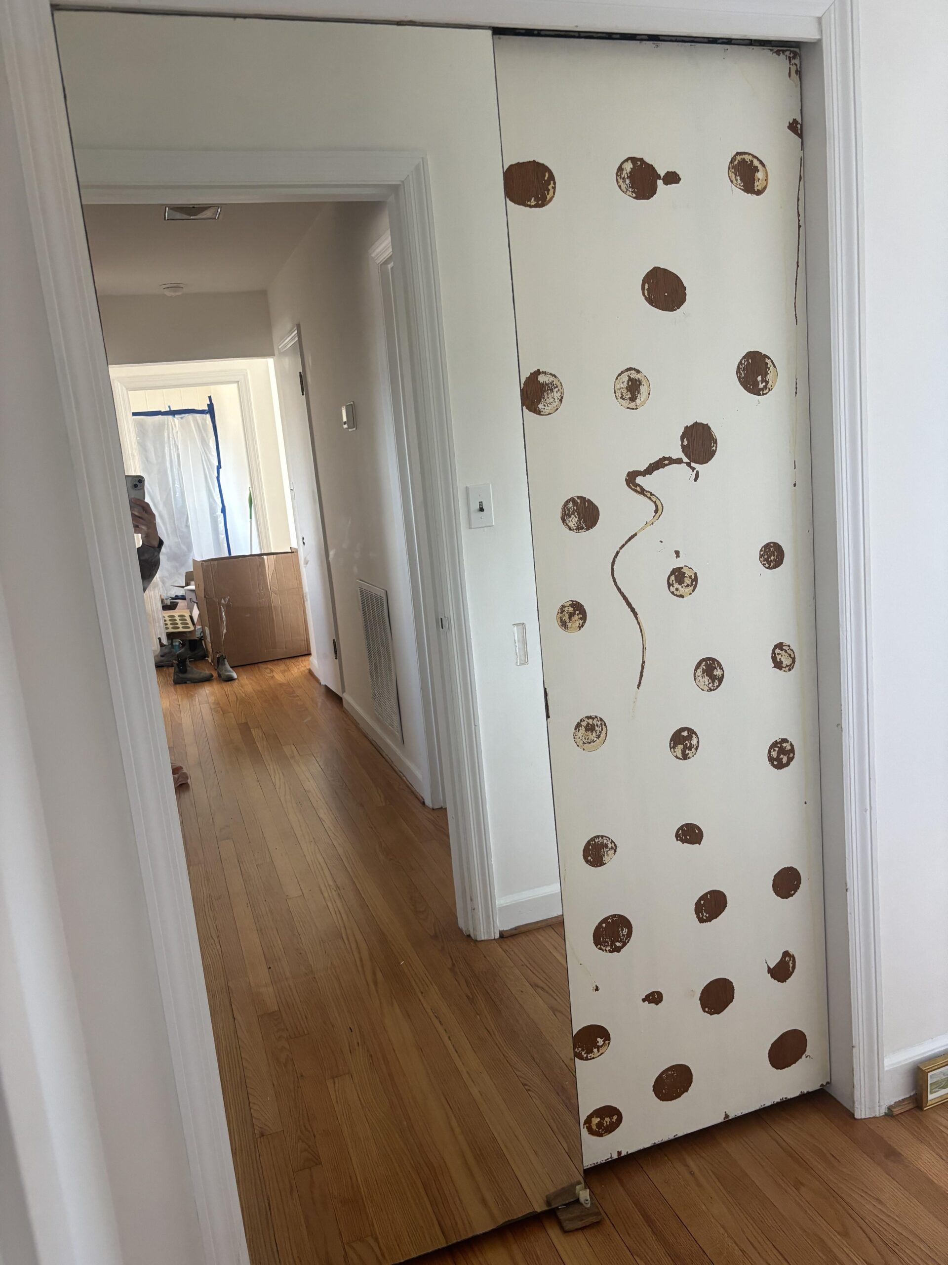 Look at door sized posters. Otherwise I would sand and fill and paint white. I assume it is a rental though?
