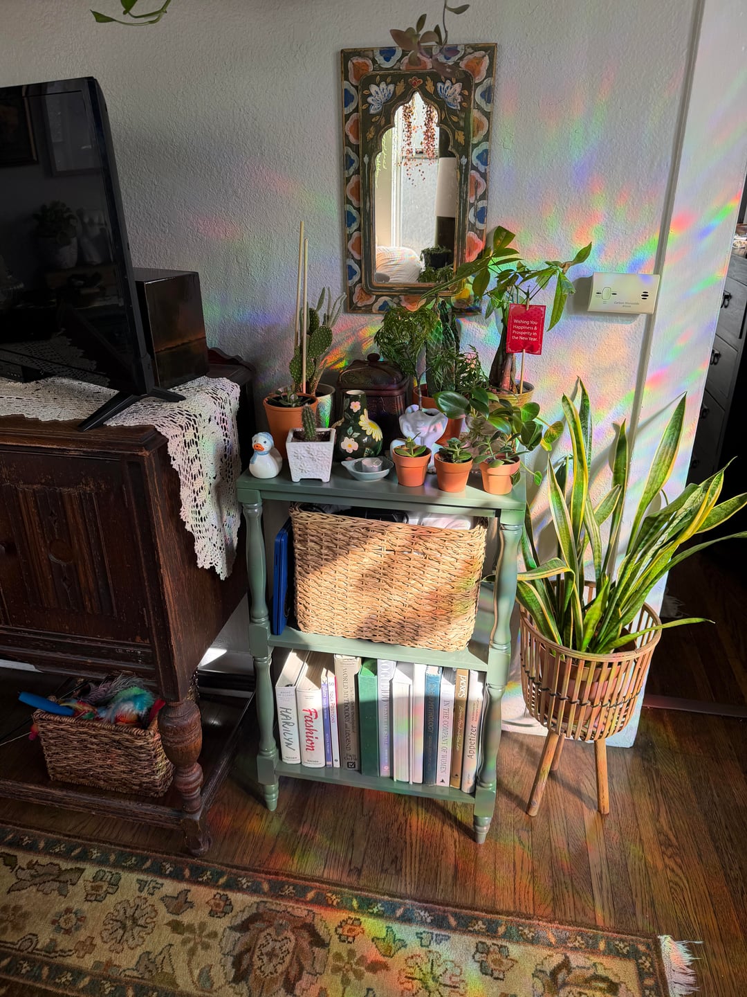 I recently got this small bookcase, and it’s been a challenge, finding a spot to put it in my apartment. I eventually decided to put it next to the TV it layered it with some books and some plants. My cat has an issue of eating my plants so I thought this would be a great spot to hide them so he can’t get to them. However, now I feel like my apartment might be a little too cluttered, does this look cute or does it look like a bit much?