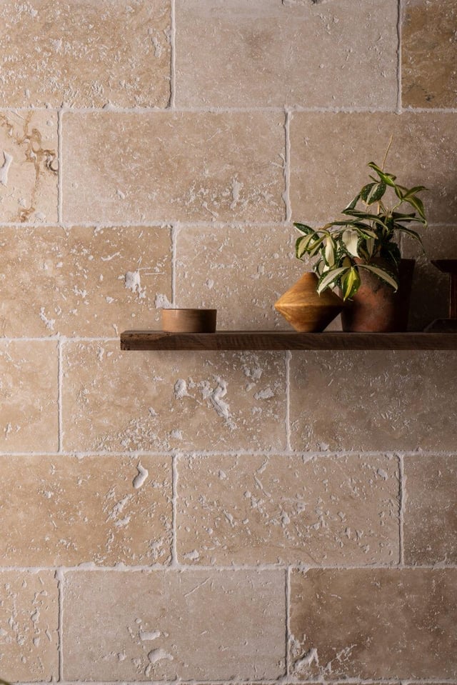 My doubts now – is the blue fan tile too glossy + modern that it clashes with the rustic travertine? Do I need an ivory gloss tile on the wall to pull it together?