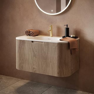 To be paired with a wooden, fluted style sink cabinet, wooden touches, white ceramics and gold fittings.