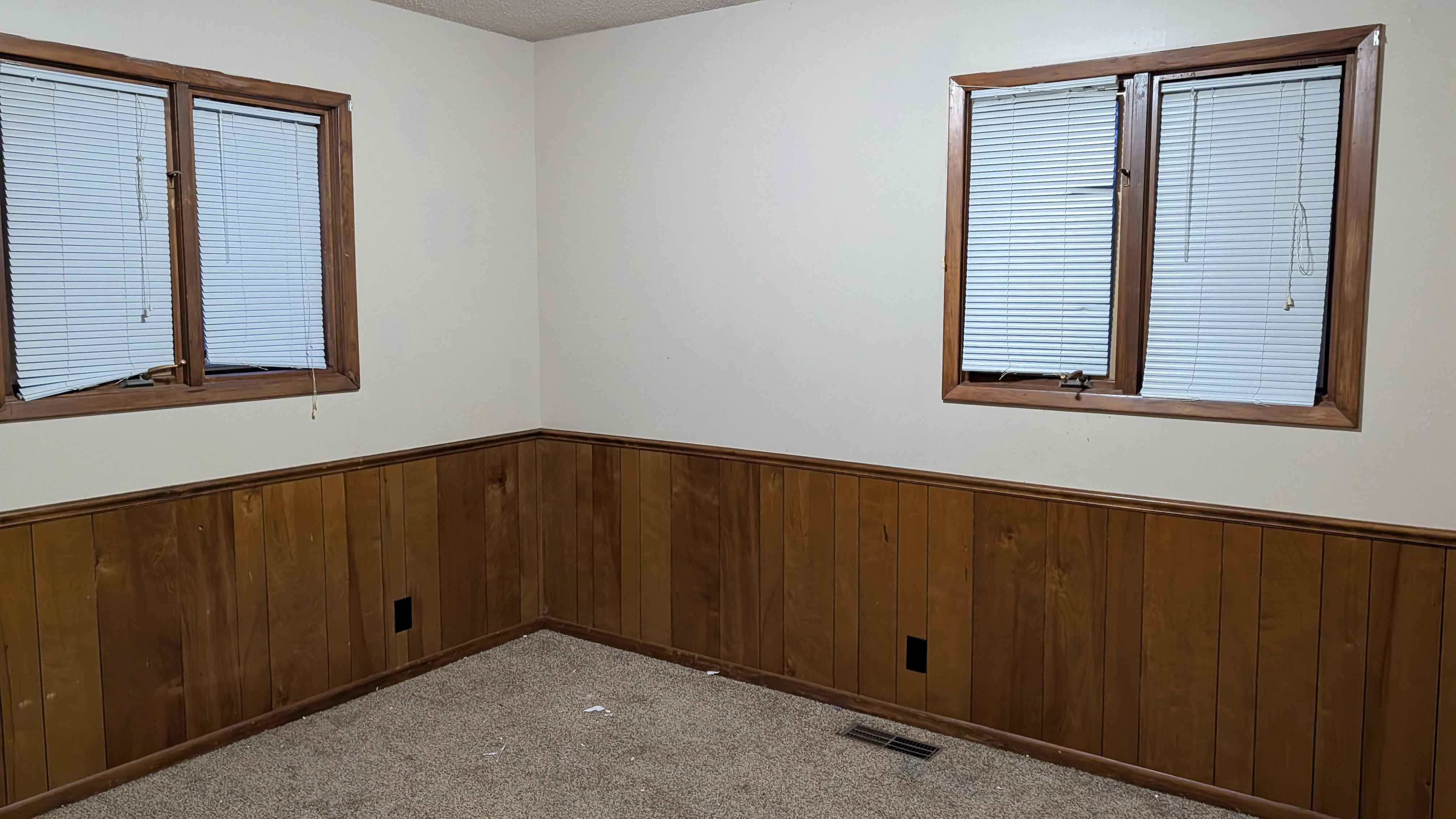 Moving into this house. It's needs all walls painted and all flooring replaced. It has paneling like this in several spaces, with a thin chair rail at the top. There is some discoloratuon in the paneling in one room. We do not want to paint all the wood trim. We are painting the walls a near-white neutral tone.
