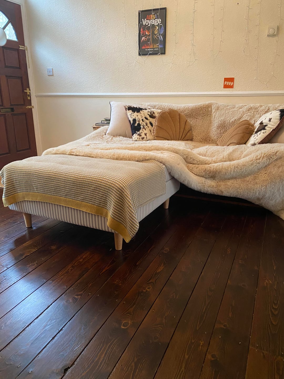 Slowly getting there with my new place. I need to get a rug as the floorboards are slippy, but not sure what colour or pattern to go for. I was thinking cream with pink elements but not sure if that would clash! Any other thoughts and suggestions are very welcome as I still feel like something is missing from this room