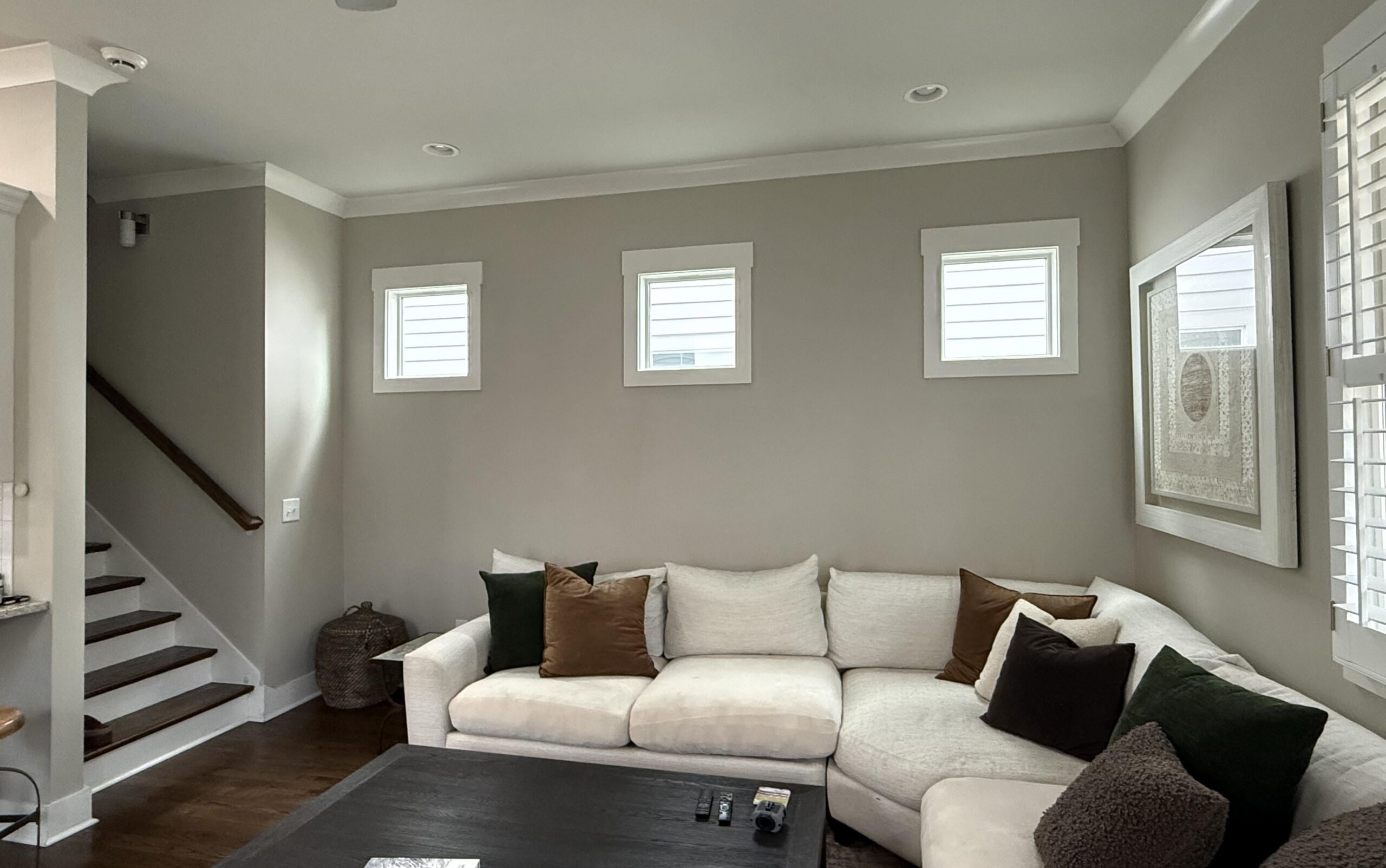 I’d probably just put a tall plant or floor lam in the corner where that basket is. If you really wanted, you could pull the couch away from the wall a bit and put a banquet table behind it, then add some vases / statues for height. I don’t think there’s any art that would work well, and while you could do a Roman shade treatment on them, I feel like it would look awkward.
